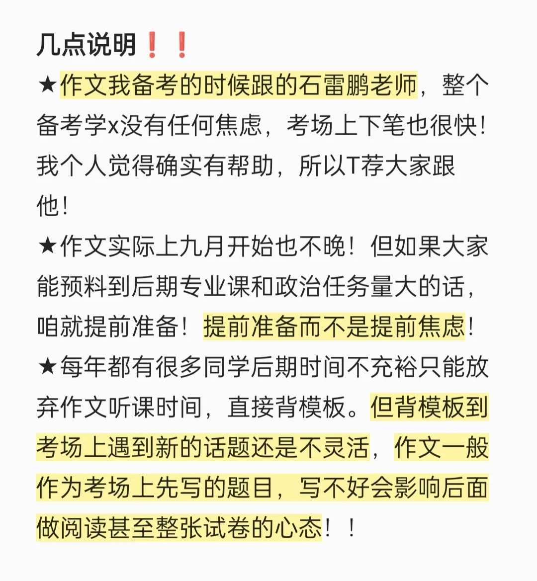 ★每年都有很多同学后期时间不充裕只能放弃听课时间直接背模板。但背模板到考场上遇到新的话题还是不灵活,作文一般作为考场上先写的题目,写不好会影响后面做阅读甚至整张试卷的心态!!