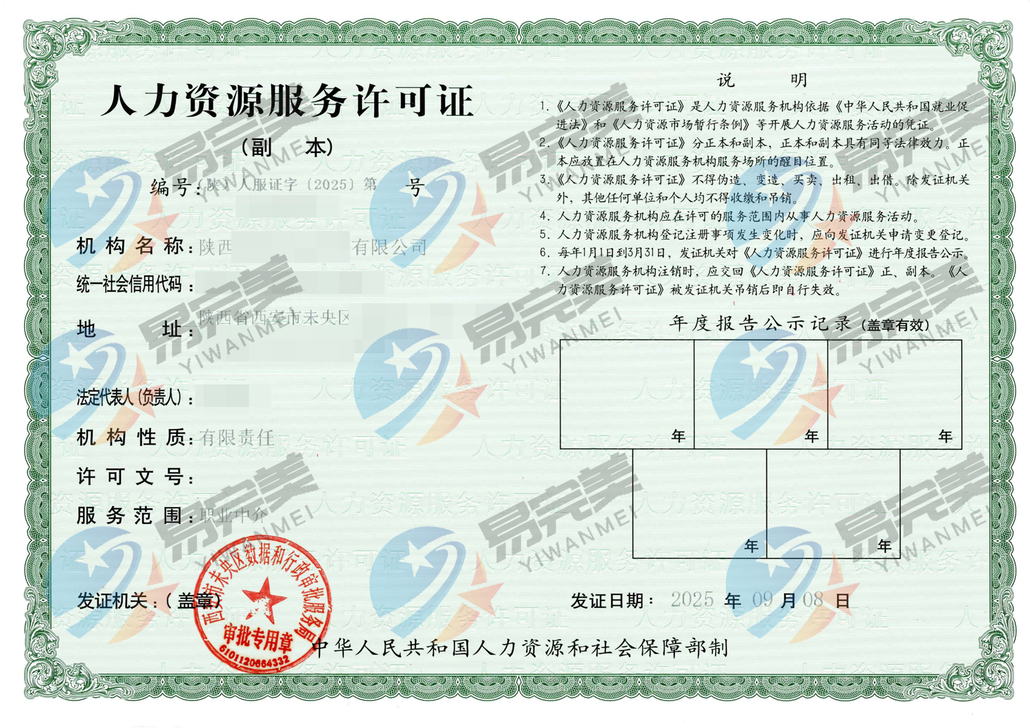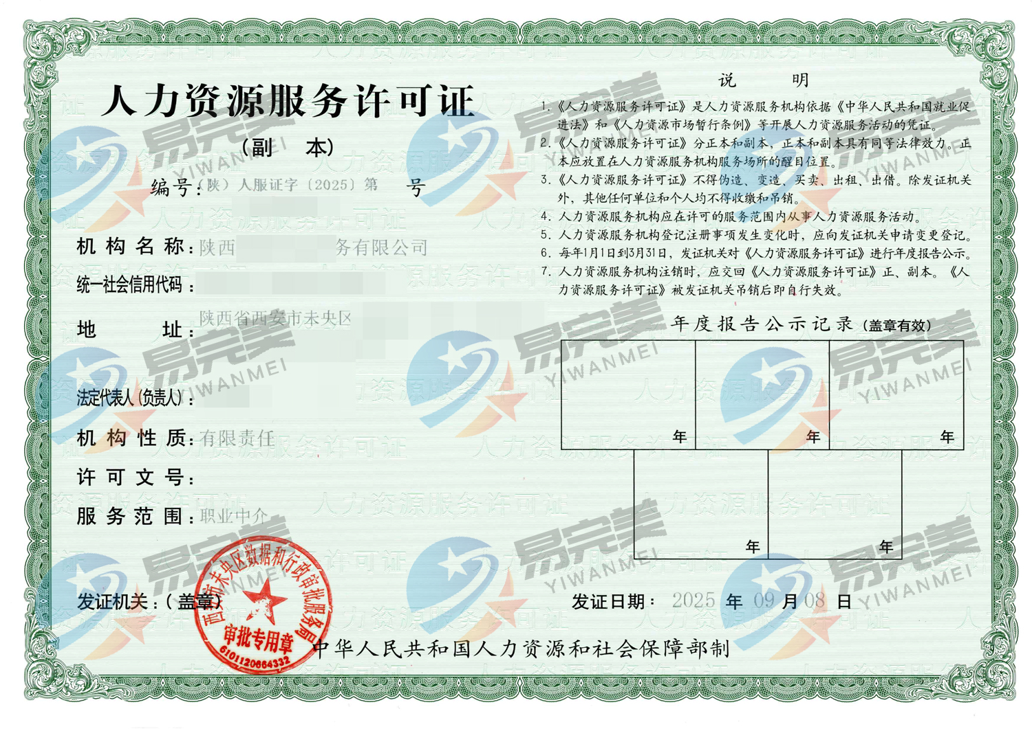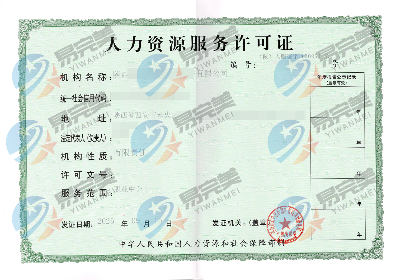 陕西新下2025年09月08日-09月15日人力资源服务许可证
