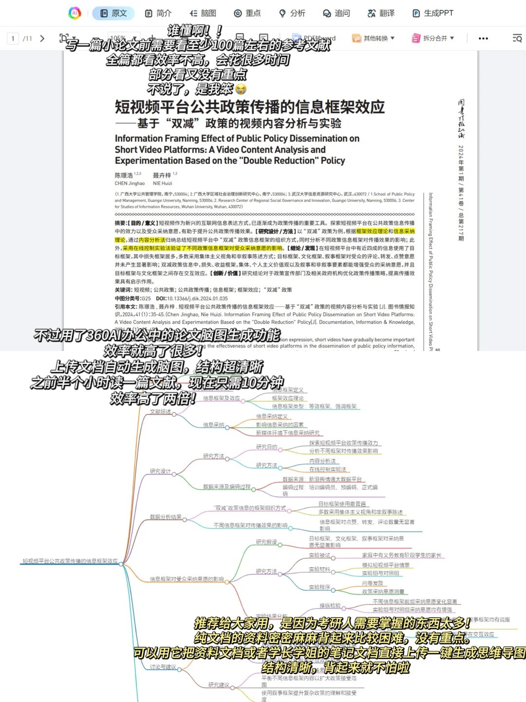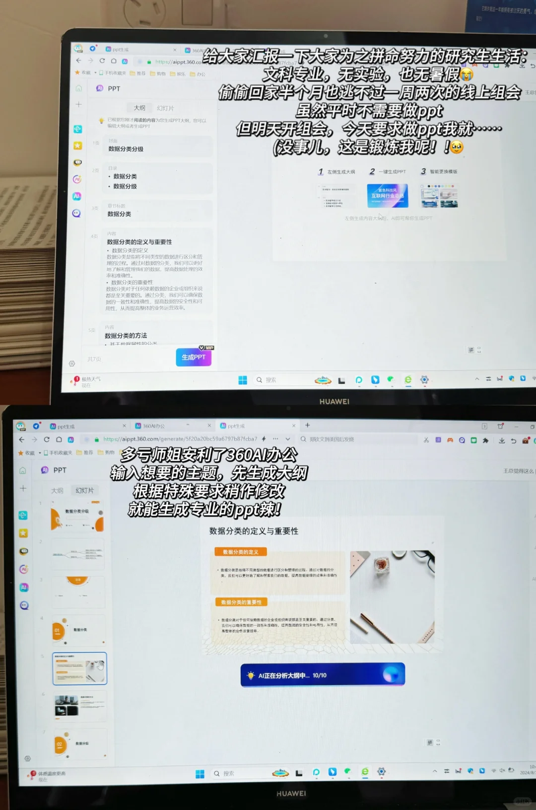 我知道八月份有些同学心态开始出现波动,怀疑自我,甚至想弃考。很多同学问我是不是考上研究生就轻松了,其实并不是。研究生有没有假期取决于老师,偷偷回家半个月,也逃不过一周两次的线上组会。平时没有要求做PPT,但临时通知大家能想到我有多焦虑!!好在师姐安利了360AI办公,输入想要的主题,先生成大纲,再生成PPT,三分钟就能搞定!