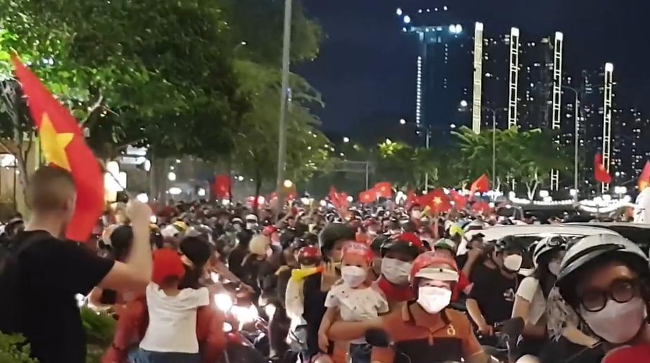 东南亚运动会上越南U23击败泰国U23首次夺得冠军,这个相当于我们在亚运会上夺得冠军一样,所以越南民族都自发上街庆祝游行。非常有意思的是他们很多人都是骑上自己的摩托车,摇动这国旗,亮着车灯,所以从上面看十分壮观,这是我们多少年没看到过了,除了02年我们进入世界杯后,都没见过足球迷肆意庆祝的一面了。