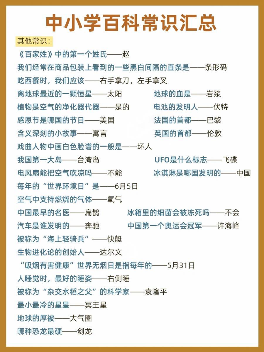 【小学生“必备百科知识”,快来考考你家孩子】 小百科常识积累,不可不知的百科常识