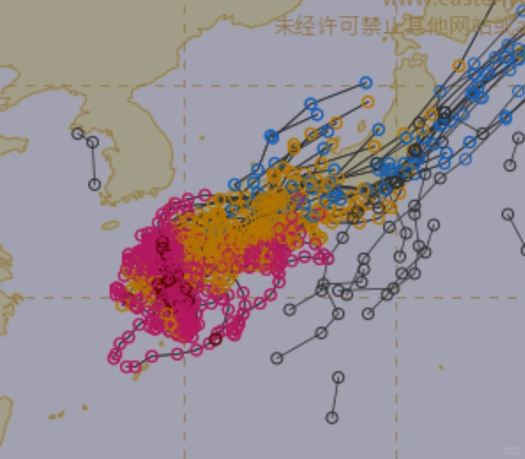 不过目前主流的气象台预报是没有发生变化的气象台都认为他还是会向东偏北方向横扫日本,但是部分机构已经给出了这样向西南方向折的预报,以我们必须要重视起来。一般气象台它是报一个相对稳妥的路径,对于新路线的更新相对滞后,像是去年的台风卡努,正是由美国的g fs最先提出会向东转折,这也引导了后面所有机构以及各个气象台的预报。而这一次也是g fs先提出来会向西南方向转折,到目前为止,不光是gfs ,现在ec,中国部分机构也调整为向西南方向移动所以这个路径也有可能性