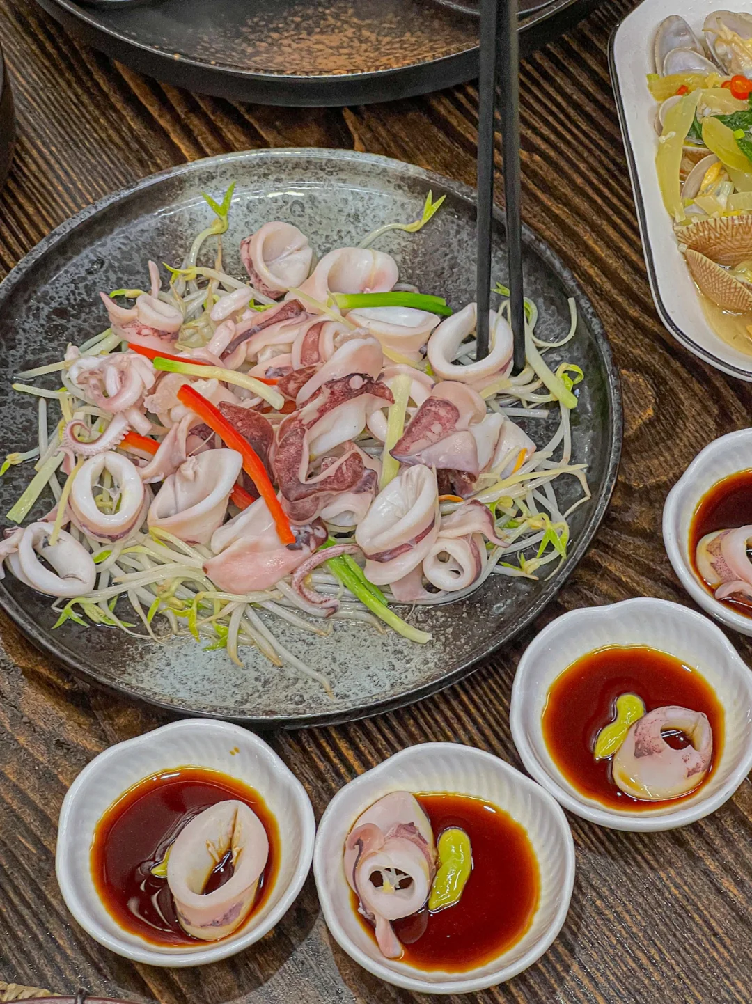 白灼鱿鱼肉质鲜嫩厚实蘸一下芥末酱油更提鲜