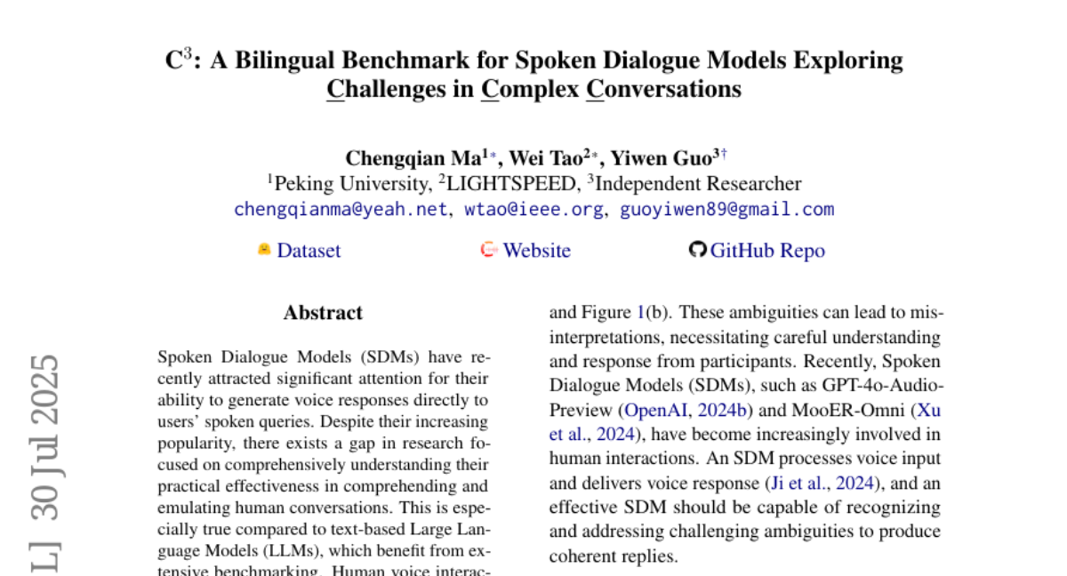 A:C3是北京大学团队专门为测试语音对话模型而创建的双语基准测试集,包含1079个中英文对话实例。它的特别之处在于专门收集了包含语音歧义、语义歧义、省略、代词指代和多轮交互等复杂现象的真实对话,是首个系统性评估语音AI处理复杂对话能力的测试集。