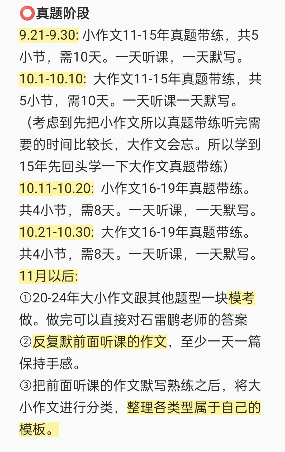 ★10.1-10.10: 大作文11-15年真题带练,共5小节,需10天。一天听课一天默写。