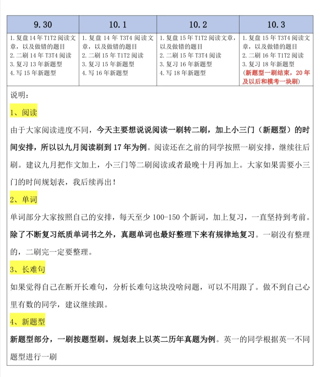 halo宝子们!今天来给大家分享八月的阅读日规划表啦~ 针对上表做以下说明👇🏼 [一R]阅读 由于大家阅读进度不同,今天主要想说说阅读一刷转二刷,加上小三门(新题型)的时间安排,所以以九月阅读刷到17年为例。阅读还在之前的同学按照一刷安排,继续往后刷。建议九月把作文加上,小三门等二刷阅读或者zui晚十月再加上。大家如果需要小三门的时间规划表,我后续再出! [二R]单词 单词部分大家按照自己的安排,每天至少100-150个新词,加上复x,一直坚持到考前。 除了不断复x纸质单词书之外,真题单词也zui好整理下来有规律地复x。一刷没有整理的,二刷完一定要整理。 [三R]长难句 如果觉得自己在断开长难句,分析长难句这块没啥问题,可以不用跟了。做不到自己心里有数的同学,建议继续跟。 [四R]新题型 新题型部分,一刷按题型刷。规划表上以英二历年真题为例。英一的同学根据英一不同题型进行一刷 昨天发了九月的作文日规划表,大家可以综合起来,参考每天的任务安排,根据自己的进度自行调整哈~🌷🌷