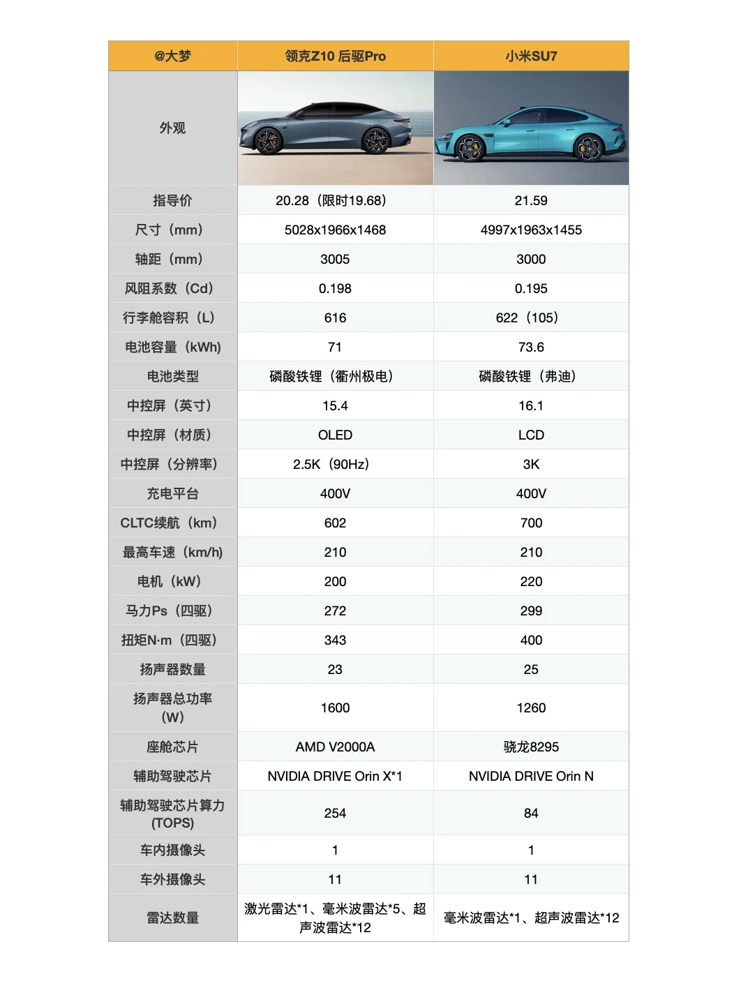 领克Z10这车对比最多的肯定就是小米SU7了,价格基本也就是对着来,所以我盘了一个对比表格,就挑了价格最接近的版本; 1、标准版:领克更便宜、智驾硬件更好;小米动态参数更好,有前备箱; 2、Pro版:领克电池大0.7度,有HUD;小米智驾硬件更好,动力、前备箱如上; 3、Max版:领克是双腔空悬,电机功率更大;小米电池大6度,智驾硬件更好; 大概这些吧,外观的话就看个人喜欢了,所以问题来了,你会选哪台?