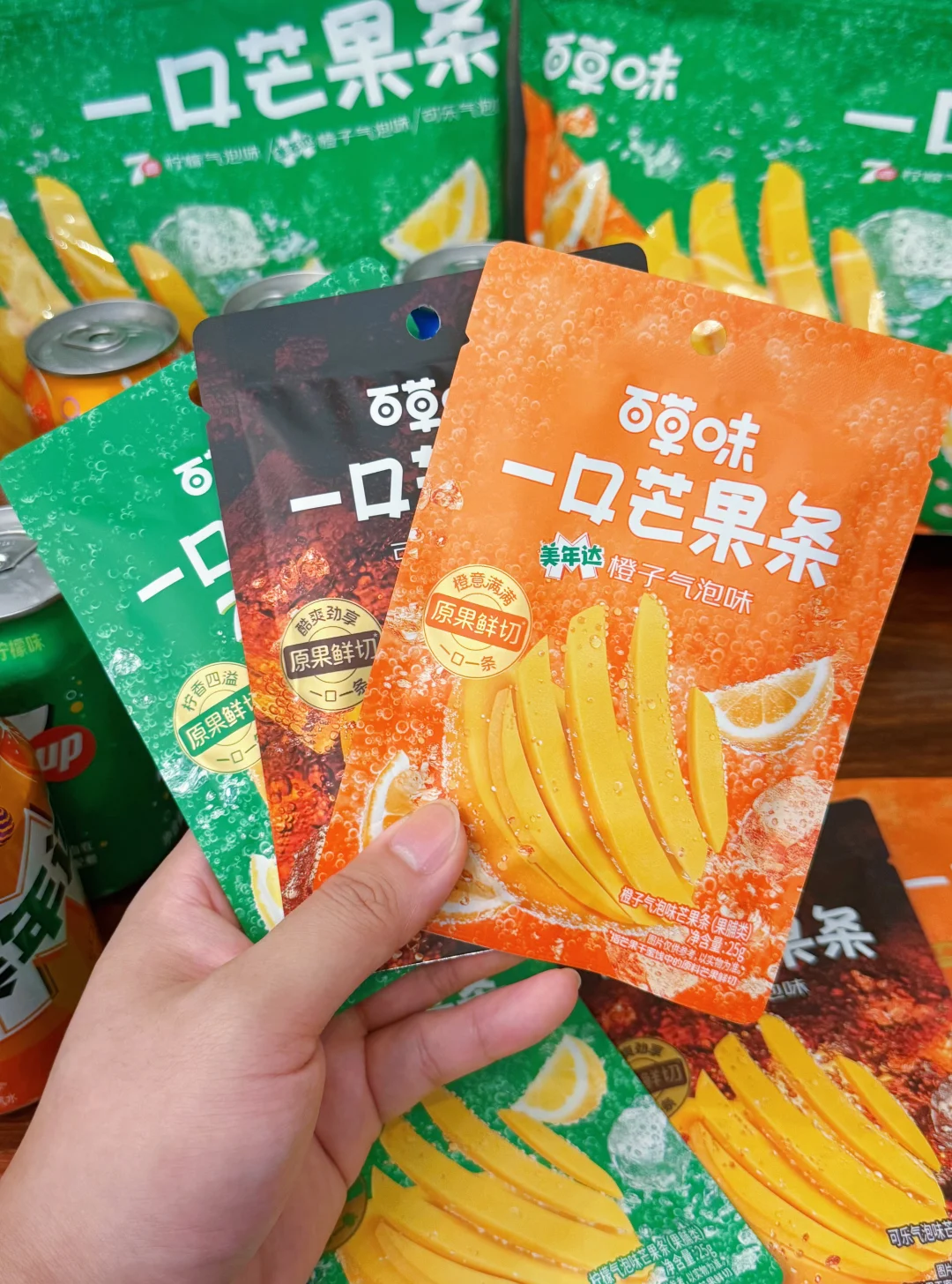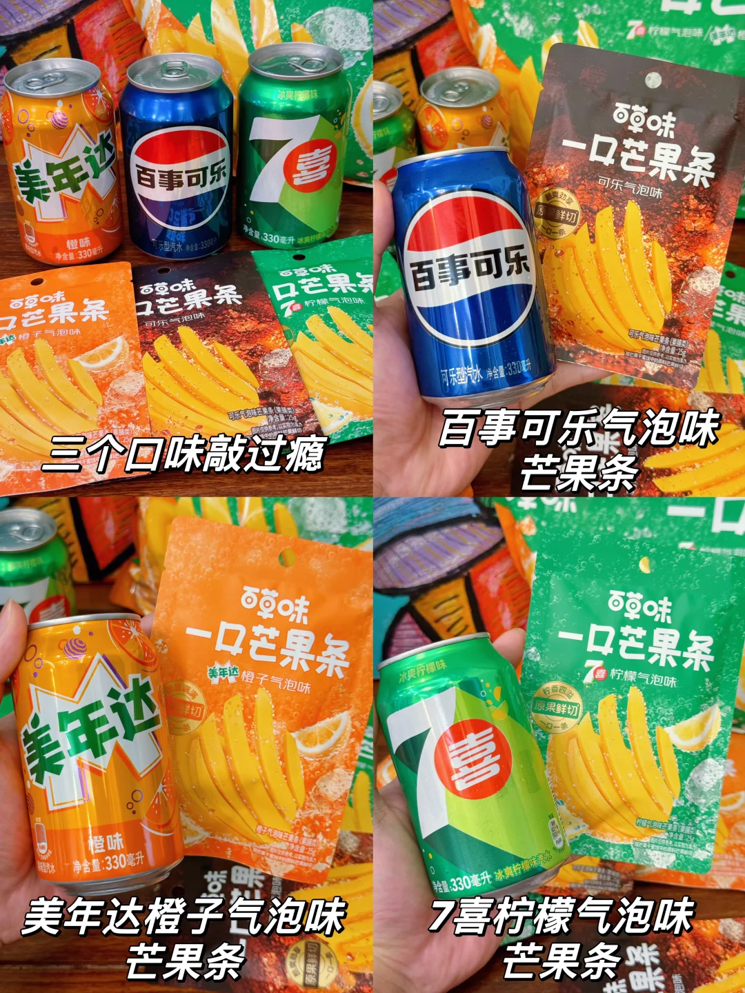 天呐!百草味竟然和百事可乐、美年达、7喜联名推出了气泡味芒果条!这神仙组合你们试过没?真的太上头了!