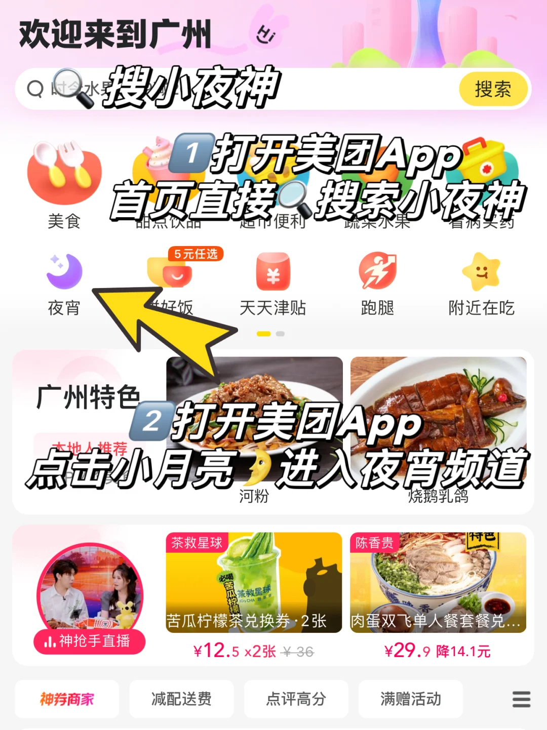 1️⃣在美团app点击小月亮🌛进入夜宵频道页,