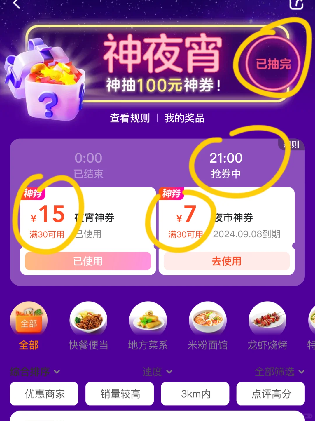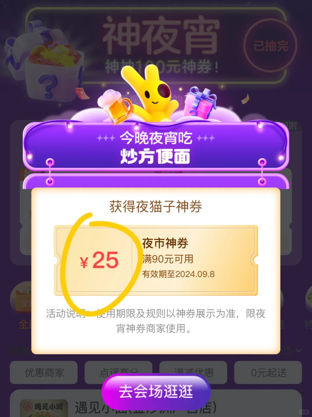 还可以直接右上角的抽夜宵盲盒,我今天好厉害了,直接抽到了满减25的夜宵劵,真的敲便宜!