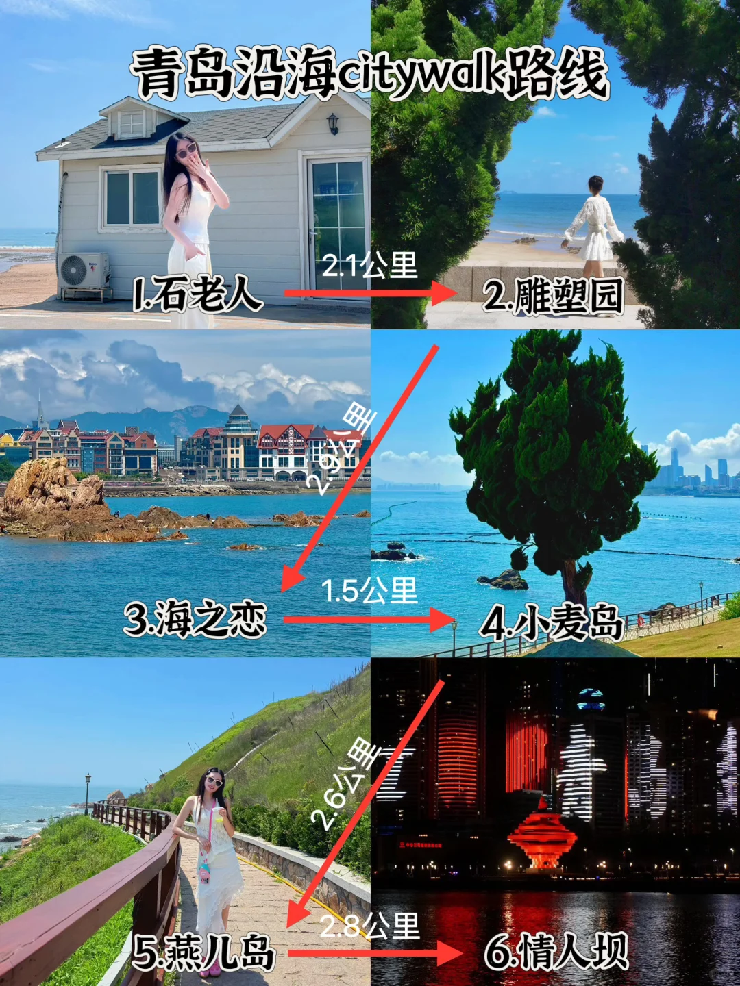 立秋后的青岛尊嘟美的next level了 想看蓝蓝的大海到底怎么玩❓ 一定不要错过这条神仙沿海citywalk路线🌊 手把手教你拍出人生照片📷 - 🌟【青岛必打卡沿海citywalk路线】 石老人➠雕塑园➠海之恋➠小麦岛➠燕儿岛 ➠情人坝 - 📍【游玩攻略】 1️⃣石老人 ❶看橘子海日出:5点半抵达(具体看天气预报) ❷拍网红山洞:导航大邦足球俱乐部 穿过停车场 台阶下去后左拐走至礁石区 再绕到礁石后 共3个山洞 要注意退潮才🉑去 ❸拍白房子:导航浩运海鲜大排档 JJ同款很韩 ⇩ 2️⃣雕塑园 ❶拍松柏迷宫:导航东海东路海龙路(公交站) 下去 松柏尽头就是大海 ❷拍爱心石子路:面对雕塑馆往左走 人少很出片 ❸也可看日出哦!比石老人人少 ⇩ 3️⃣海之恋park ❶拍狗尾草坪:导航花神海 在狗尾草中随意拍都出片 ❷拍彩色房子和白色灯塔 坐在公园长椅看海也很惬意 ❸沿着海岸线🉑步行至小麦岛 ⇩ 4️⃣小麦岛 ❶拍孤独的树:上岛沿中间路上坡 右拐一直走 ❷拍石头围栏:在厕所对面 ❸拍五棵树:在中间两棵树后草坪 但草有点秃 需后期 ❹拍各种通往大海的石子小路 ⇩ 5️⃣燕儿岛 ❶拍网红山洞:导航燕儿岛驿站 下至海边左拐到头 记得开广角 ❷拍海边爱心草坪:导航心屿咖啡 还有好多机位 ❸拍济州岛木栈道:导航侨园新村 从心屿咖啡下木栈道一直往前走就到了 ❹拍漫画山洞:导航燕儿山网红洞 在隧道中间 ⇩ 6️⃣情人坝 ❶看灯光秀:除周一每晚19:40至21:00循环播放 ❷白色灯塔也是浪漫的打卡地 - 🔍【小tips】 ❶玩这条路线包里要放一些🍪噢 随时补充能量 这次我就带了宝藏零食「米多奇烤馍片」方便携带又好吃 而且还是非油炸的 个人比较喜欢孜然和原味的 酥脆酥脆的 玩累了在草坪上休息一下 炫上两包烤馍 太满足啦✌️ ❷记得带充电宝!墨镜!注意防晒哦 - 🏩【住宿】 五四广场地铁口附近 🚗【交通】 全程打滴或公交317 比较方便 🍜【美食】 附近万象城或台东夜市吃小吃