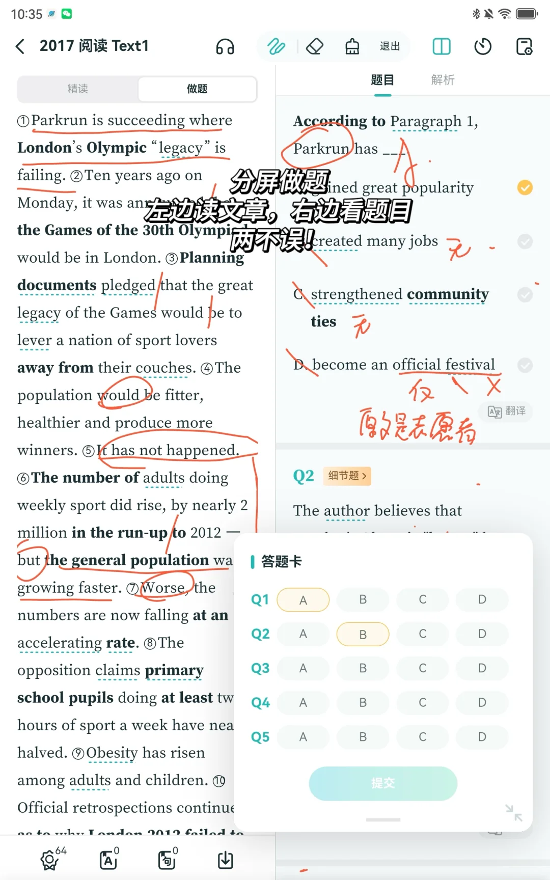 6.作者上来就明确表达自己观点的,一般后面都有转折!!一定要耐心多读一点再选!(2013text4第五段)