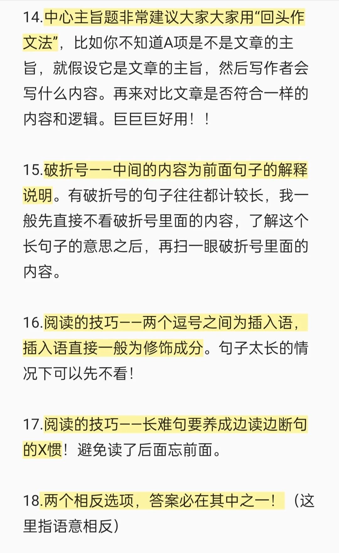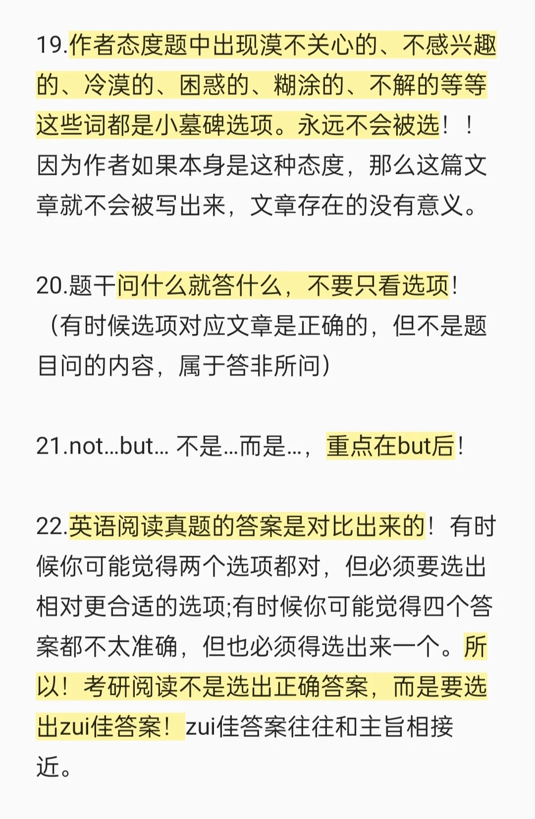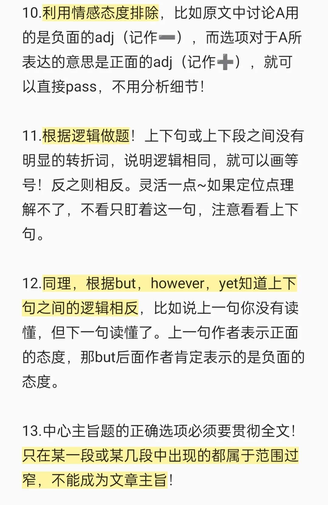 10.利用情感态度排除,比如原文中讨论A用的是负面的adj(记作➖),而选项对于A所表达的意思是正面的adj(记作➕),就可以直接pass,不用分析细节!