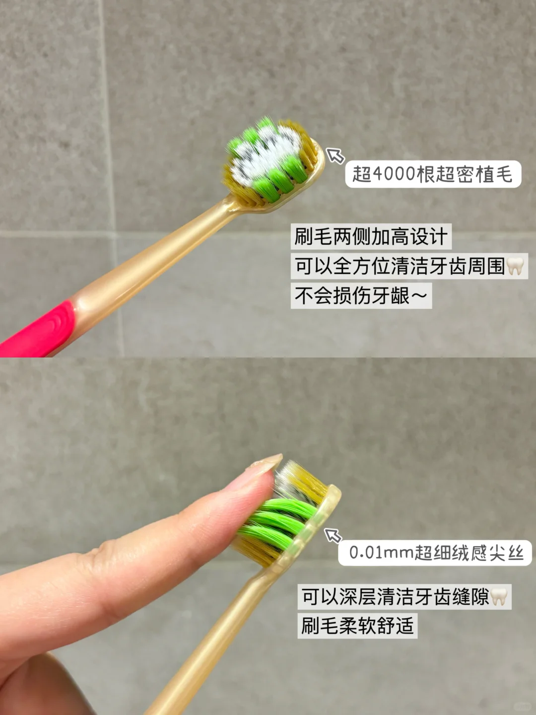 有4000+根高密植毛,59孔高密植毛,刷毛又密又软,敏敏牙刷起来也很温和~