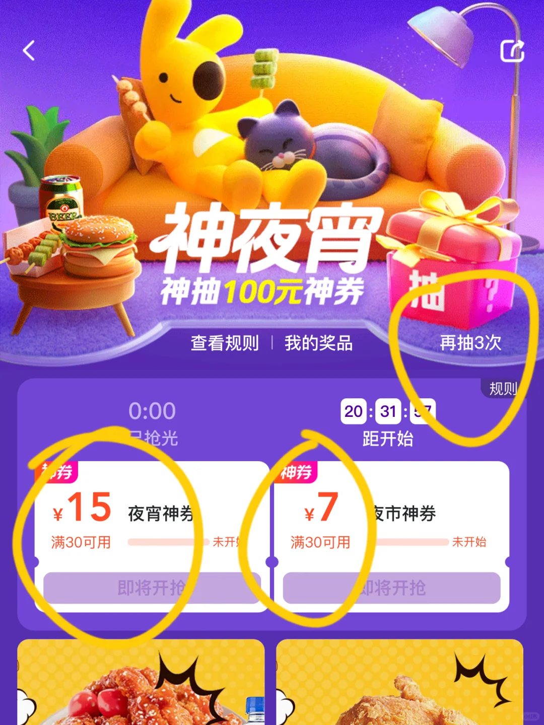 每天晚上🌛21点进入美团外卖,进入夜宵频道可以蹲点抢劵(我抢到了满减25的夜宵劵,真的敲便宜!✌️)