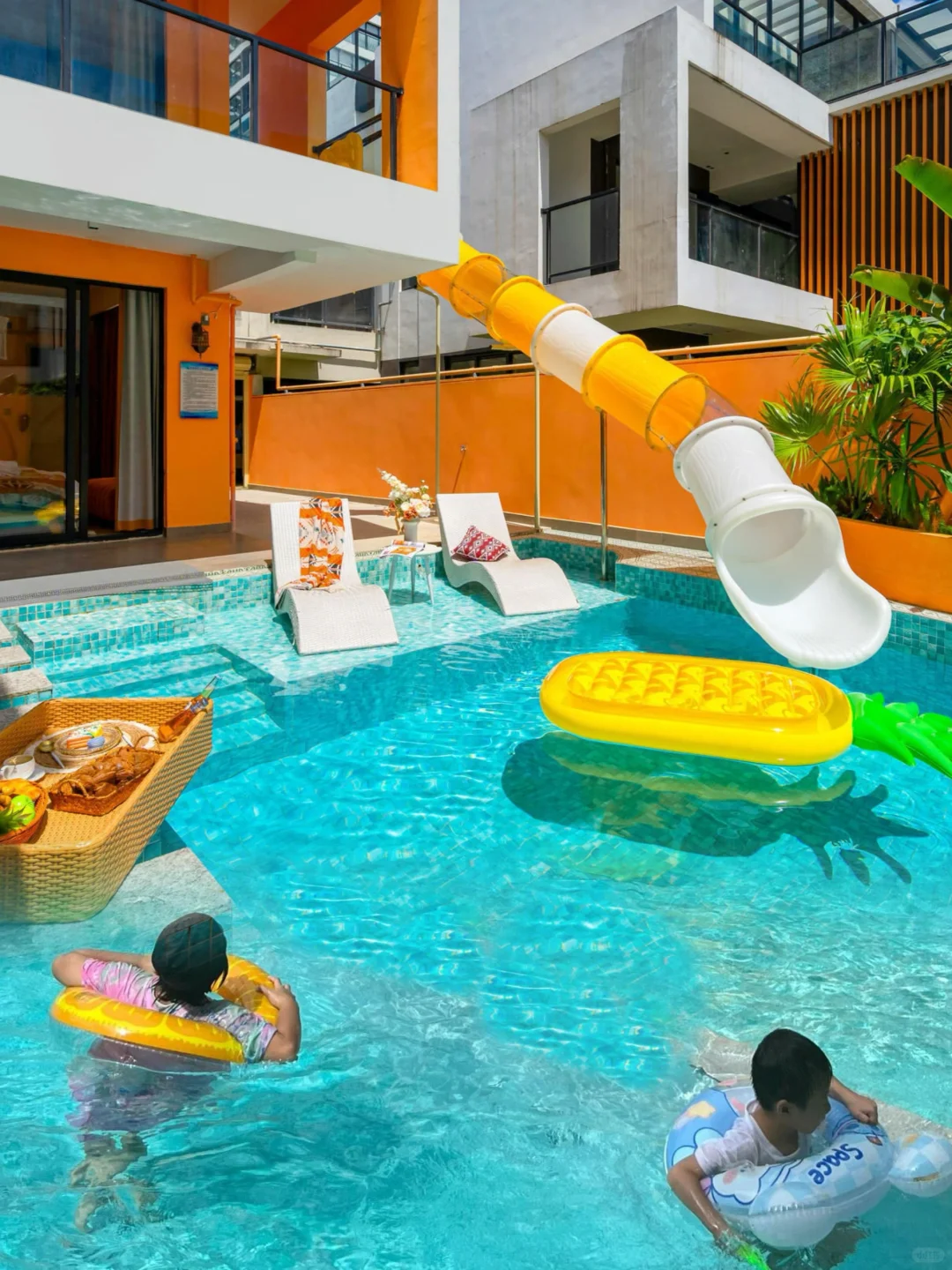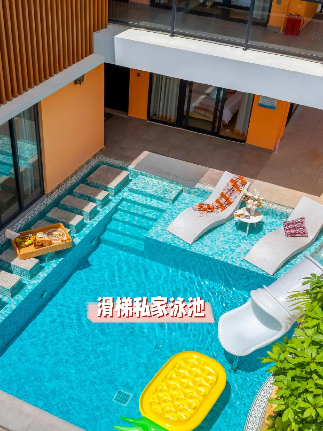 ✨✨别墅院子设有超长滑梯泳池,可以体验从二楼滑梯滑下泳池的刺激➕凉爽💦娃来了都不乱吵闹🏊♀️沉浸式畅游,主打一个不费妈👍