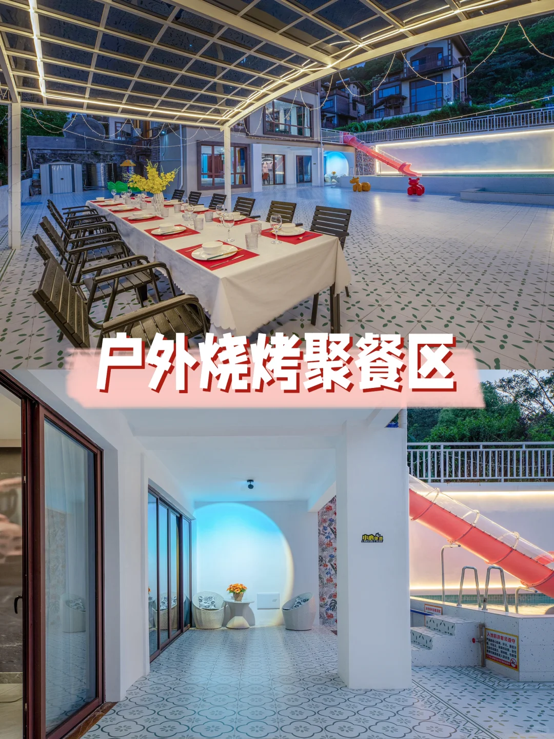 别墅院子设有聚餐长桌!可以安排烧烤🍢网红管道滑梯🛝可以从二楼直接滑到一楼泳池😆娃们都玩到不想走😭