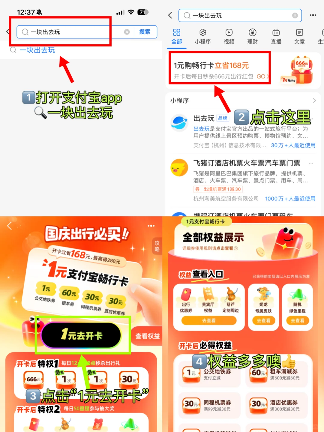 1⃣上海坐地铁可刷支付宝 去哪都方便 旅游旺季价格比平时贵 在线表扬一下支付宝新出的“一元畅行卡”活动 在支付宝🔍「一块出去玩」1r的公交地铁券 5r的打车券🚖 满99-30的机票券 5r的高铁管家优惠券 满300-30的酒店券等169元的出行礼包 只要1💰get 一单回本 多则便宜288r 能省不少钱呢❗还能参与每日秒杀 有机会获得666出行🧧哦