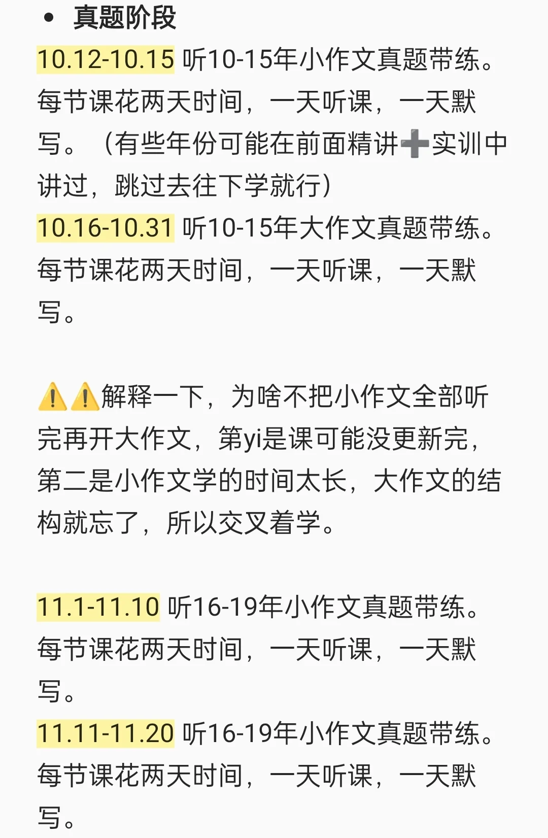 💛10.12-10.15 听10-15年小作文真题带练。每节课花两天时间,一天听课,一天默写。(有些年份可能在前面精讲➕实训中讲过,跳过去往下学就行)
