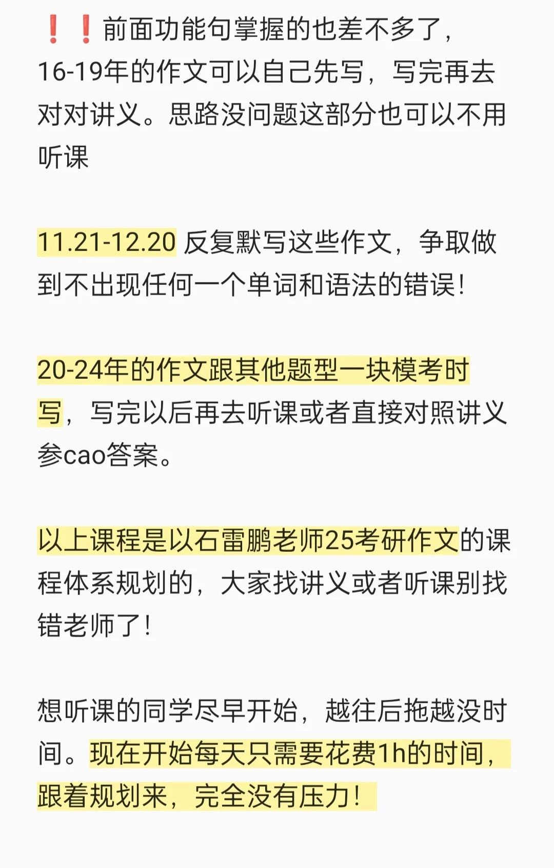 想听课的同学尽早开始,越往后拖越没时间。现在开始每天只需要花费1h的时间,跟着规划来,完全没有压力!