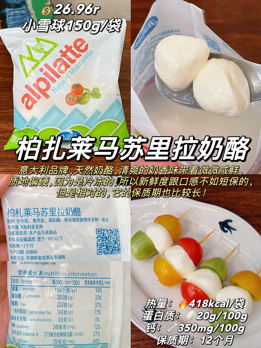 意大利品牌,天然奶酪,清爽的奶香味带着微微的咸鲜,质地也偏硬一些,因为是冷冻的,所以新鲜度上会打点折扣,口感也不如短保的Q弹,但是相对的,它的保质期也比较长!