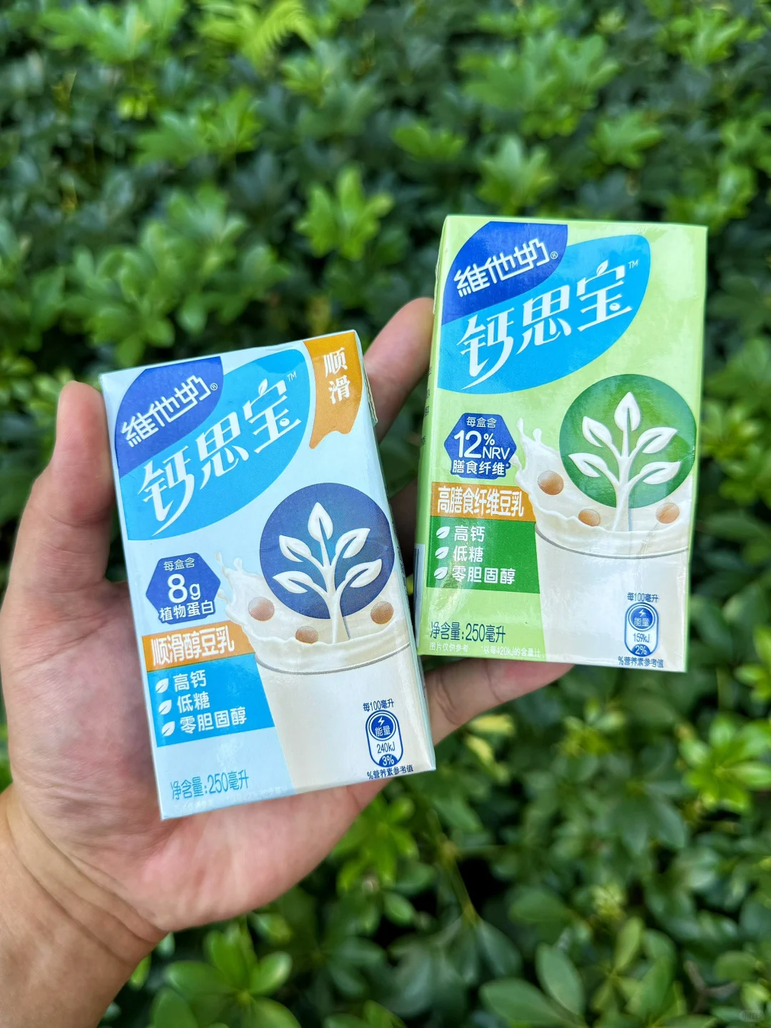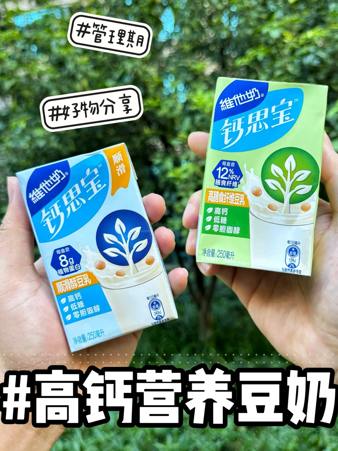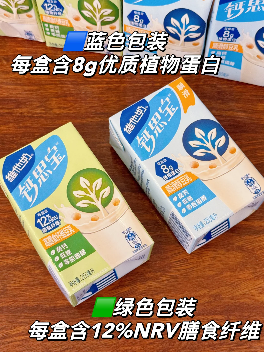又在🍊软件网购跟风买了这款超🔥的维他奶新品钙思宝,一看名字就知道钙含量不一般🦴🦴🦴 喝了几天下来这个真的好喝,而且还是高钙、低糖、0胆固醇的豆乳 老人小孩都能喝,kuku喝框框吸钙,真的就一喝一个不吱声! 钙思宝有分绿盒/蓝盒2种: 💚高膳食纤维豆乳:每盒含12%NRV膳食纤维,🥬增加饱腹感,让每日营养更均衡~ 💙顺滑醇豆乳:每盒含8g优质植物蛋白,一入口就像hin顺滑饱满,浓浓豆香尊嘟爱啦 非常建议大家喝前摇一摇,口感丝滑加倍,日常把奶茶换成这种健康饮品,好喝还不会腻!