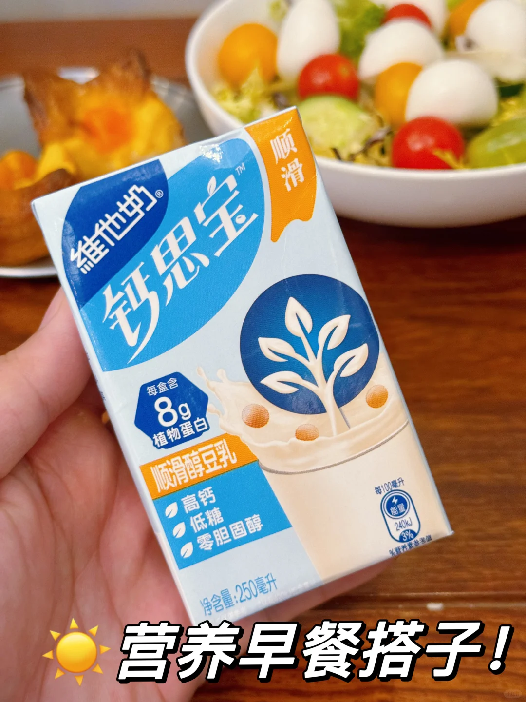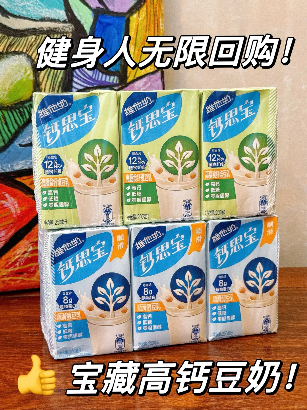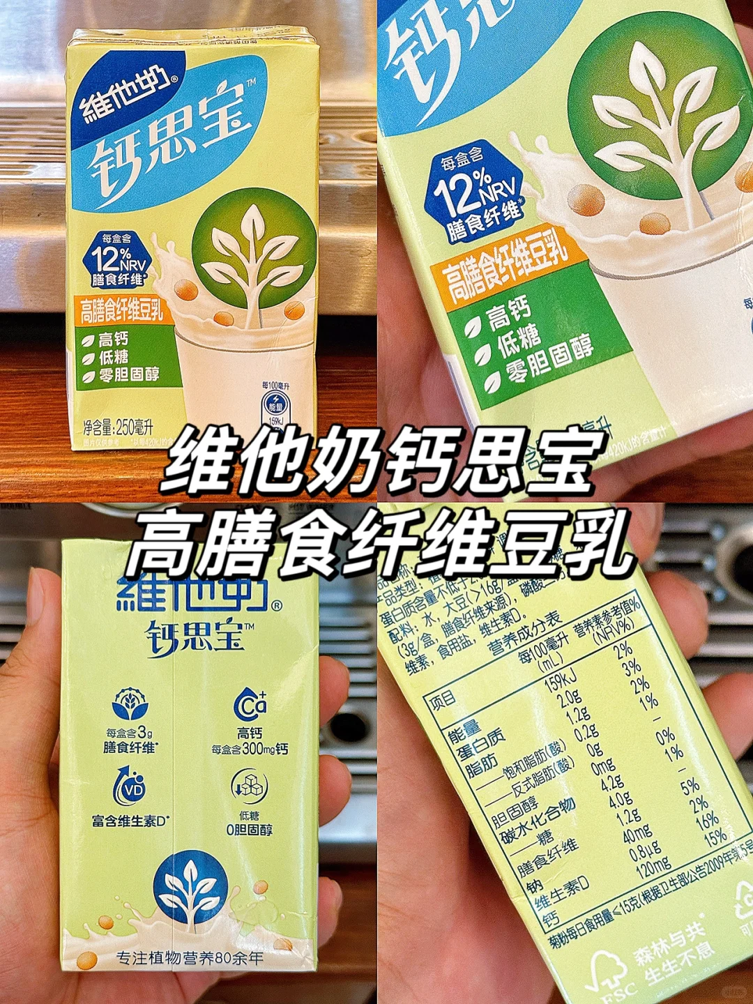 又在🍊软件网购跟风买了这款超🔥的维他奶新品钙思宝,一看名字就知道钙含量不一般🦴🦴🦴 喝了几天下来这个真的好喝,而且还是高钙、低糖、0胆固醇的豆乳 老人小孩都能喝,kuku喝框框吸钙,真的就一喝一个不吱声! 钙思宝有分绿盒/蓝盒2种: 💚高膳食纤维豆乳:每盒含12%NRV膳食纤维,🥬增加饱腹感,让每日营养更均衡~ 💙顺滑醇豆乳:每盒含8g优质植物蛋白,一入口就像hin顺滑饱满,浓浓豆香尊嘟爱啦 非常建议大家喝前摇一摇,口感丝滑加倍,日常把奶茶换成这种健康饮品,好喝还不会腻!