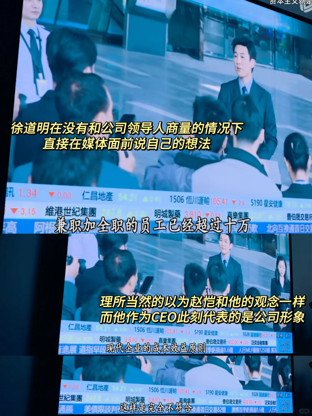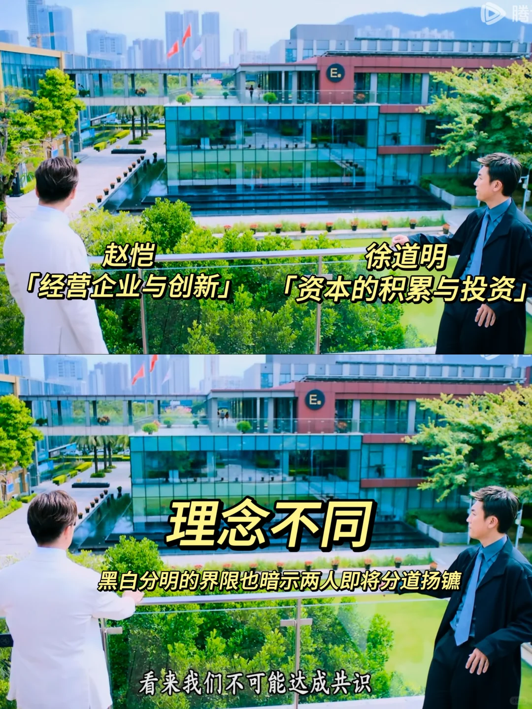 赵恺和徐道明之间的对手戏太刺激了!徐道明和赵恺刚开始的合作很顺畅,作为公司老板的赵恺也信任他,两人的状态就和好朋友一样,工作商讨都在一起。但当徐道明表露出以利为本的经营理念时,赵恺发现这并不是他所期望的,两人的关系也开始改变。