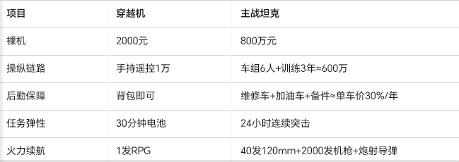 结论:无人机“单发”便宜,但“持续压制”与“地面占领”只能由坦克完成。