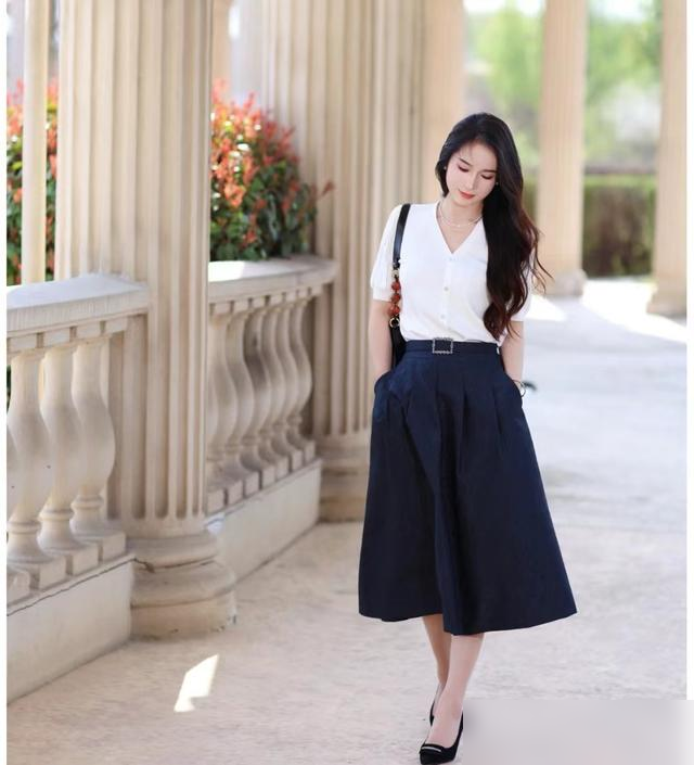这种高腰、伞状下摆的半身裙,简直是为成熟女性量身定制的——高腰设计提升腰线,伞形裙摆自然遮住大腿和臀部,对梨形身材(胯宽腿粗)特别友好。