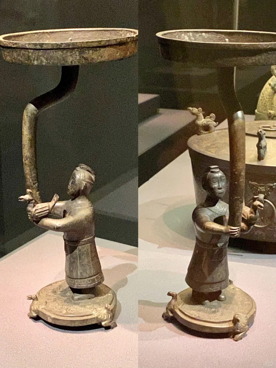 一手托🐦,灯座有三只尖嘴铜凤为足