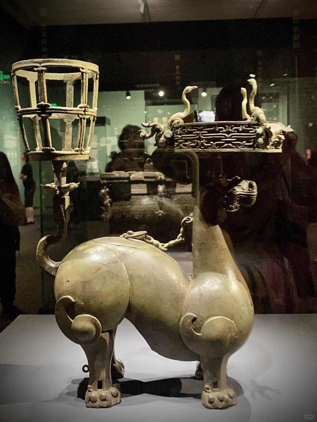 取暖器,立兽顶的灯盘上有三只鸟,鸟首鸟身兽尾。