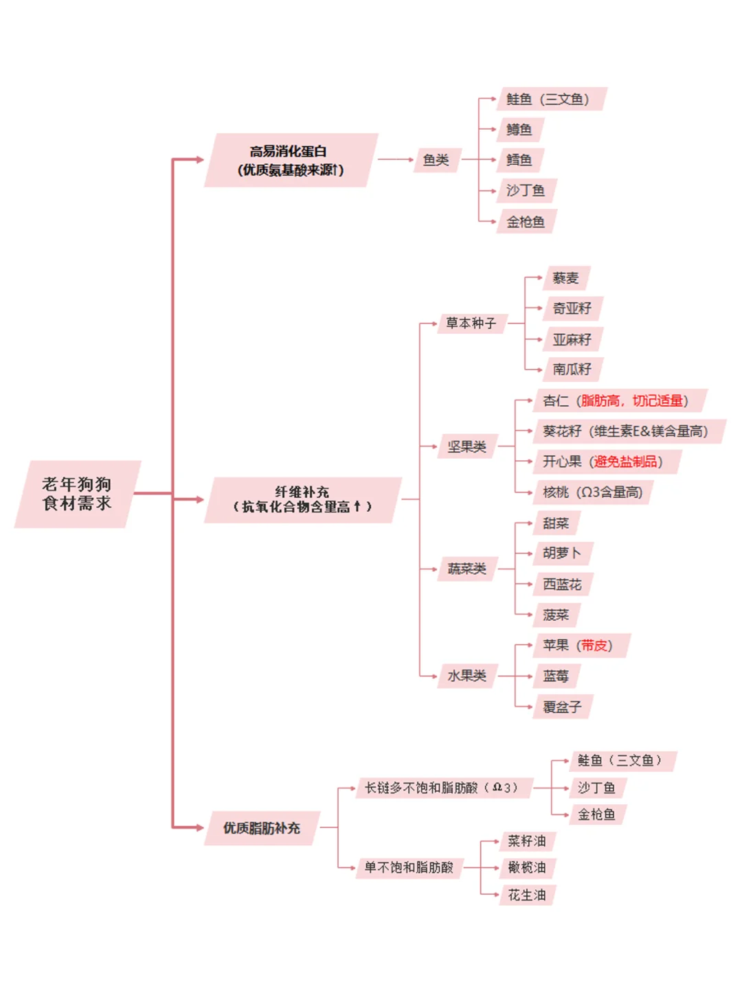 关于咪姐快要7岁的这件事,我做足了功课。看了很多款老年犬狗粮和自制的文章,同时也看了多款说配方营养适合老年犬的狗粮,也看了永生狗这本书。 - 永生狗这本书倾向狗狗“鲜食自制”,可能很多家长会觉得说这本书对于狗粮描述很片面,但这本书对老年狗所需“营养成分”确实很齐全,也注明了很多“日常的鲜食可以作为狗狗的营养补剂”。 - 结合“永生狗”所提到老年犬需所需“营养成分”,找到了3款从配方上都适合老年犬的狗粮,蛋白和脂肪比例都属于适中类型(粗蛋白:30+%,中低粗脂肪:13-15%)。
