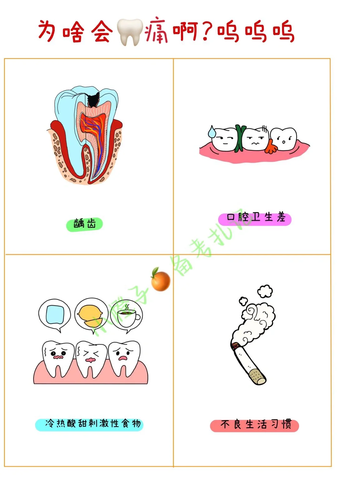 为什么我们会🦷疼痛呢❓其实,原因有很多,比如龋齿、口腔卫生差、冷热酸甜刺激性食物,以及不良的生活习惯等。这些问题都可能引发🦷疼痛,让我们痛苦不堪😣 但是,别担心,小橙子🍊🈶️👇