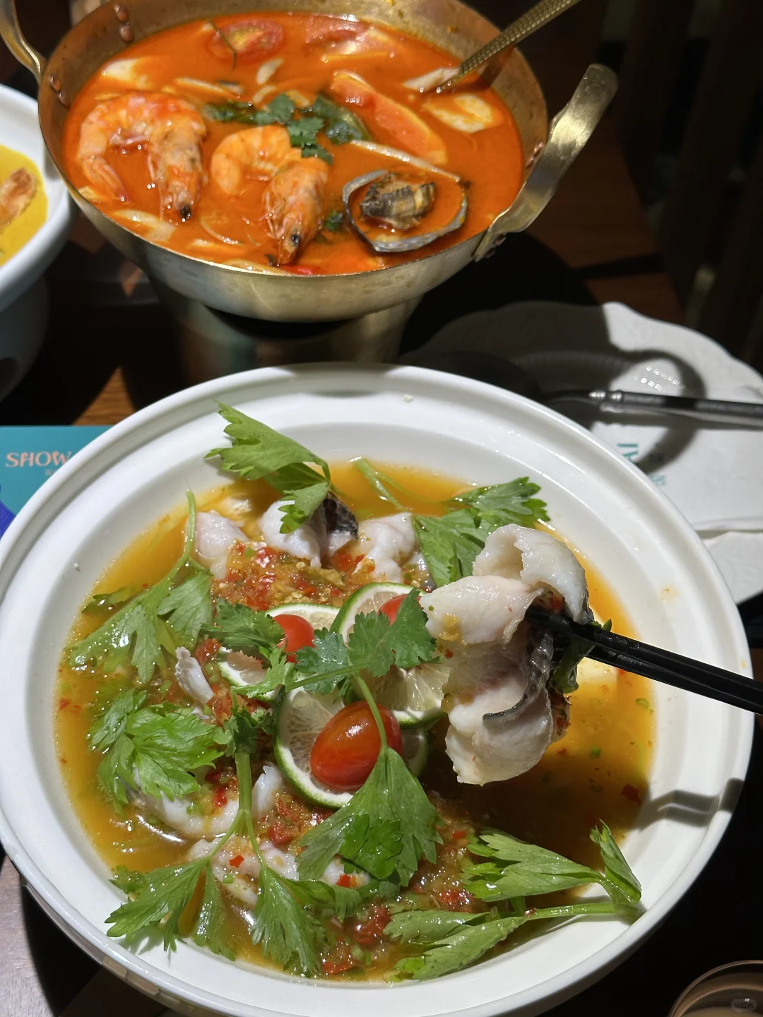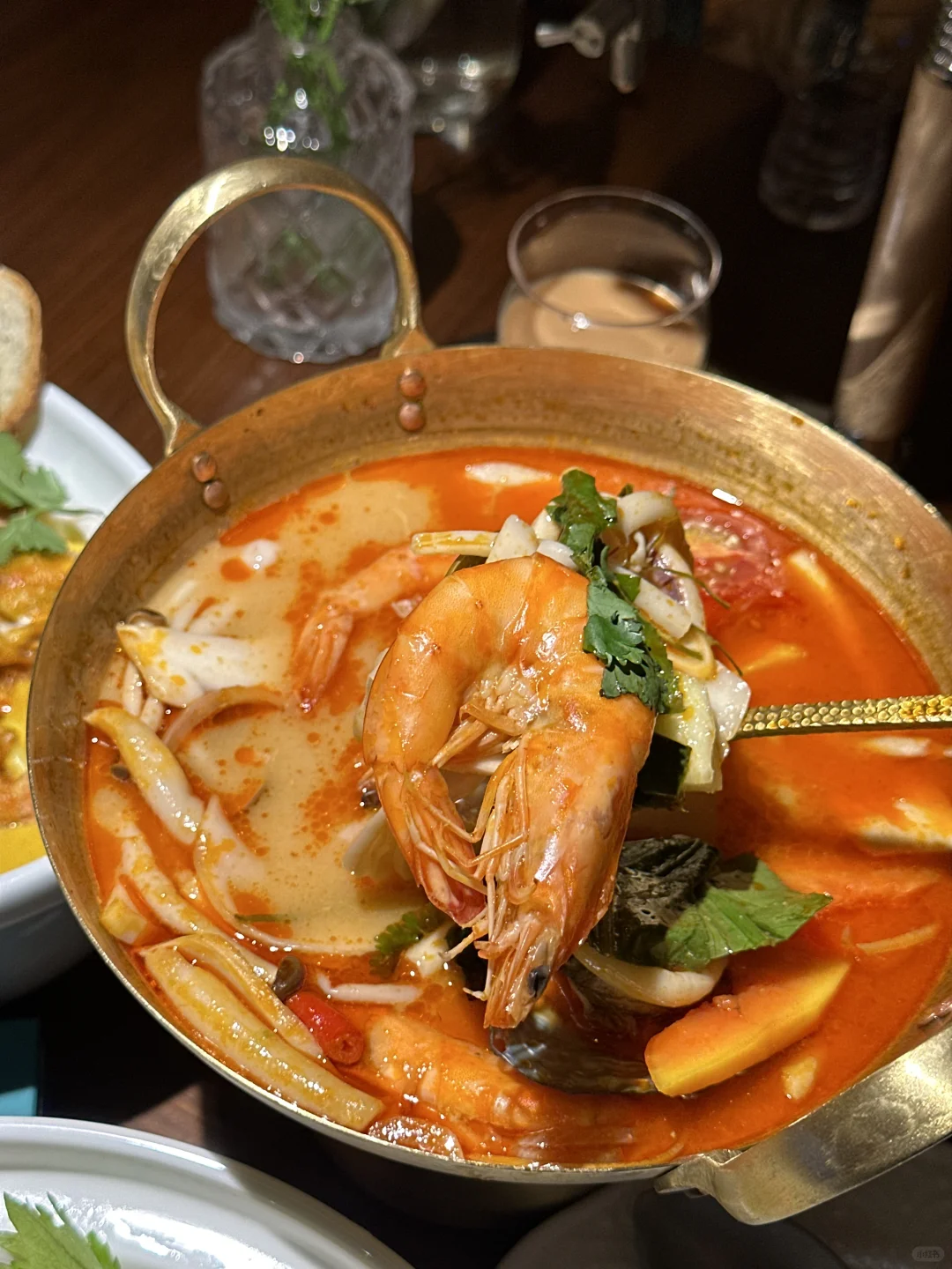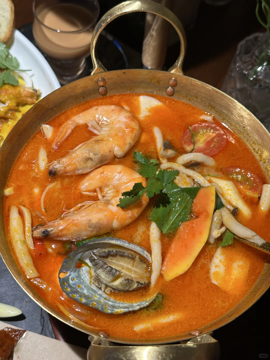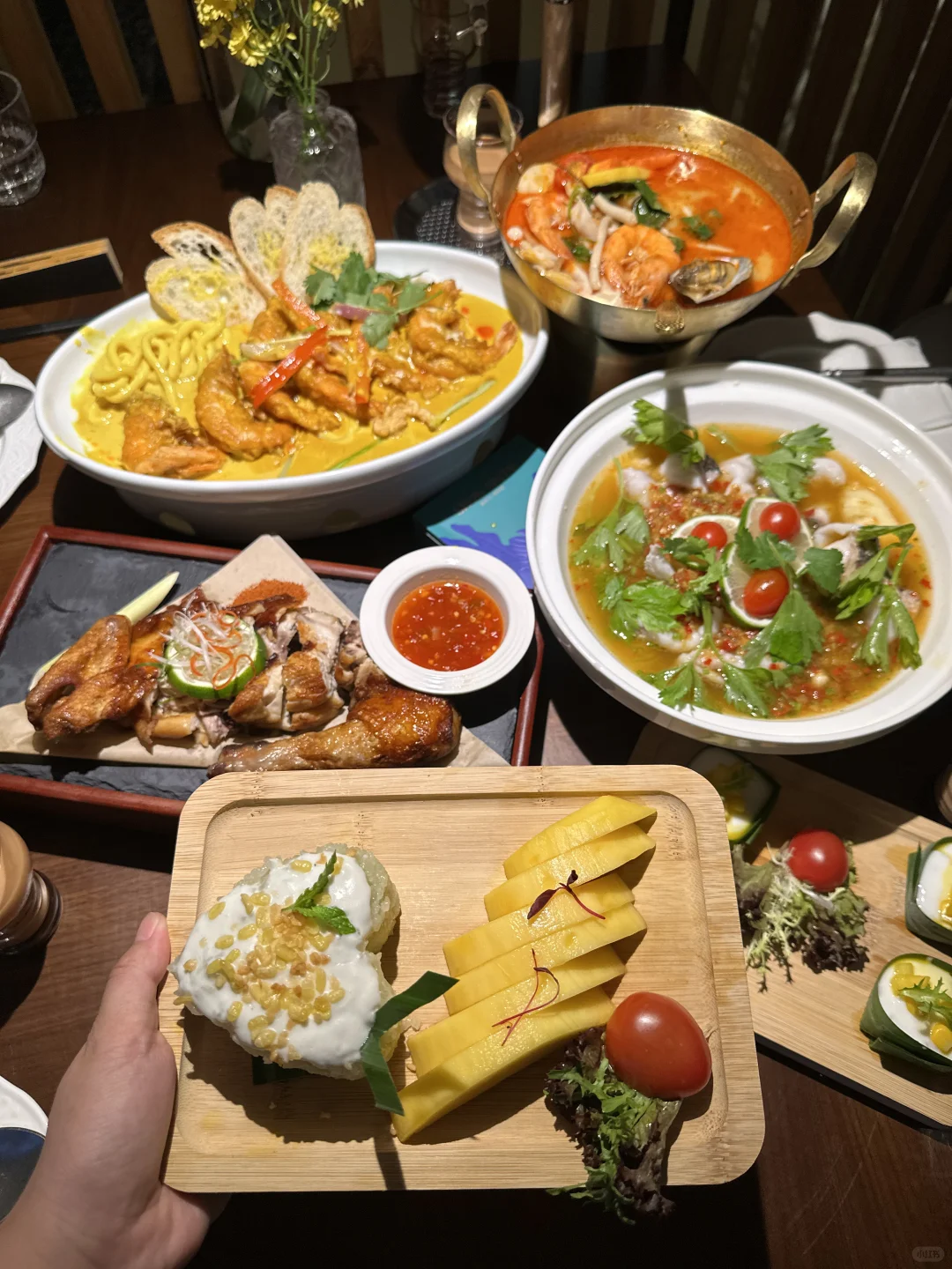 近期桂林好火的一家泰餐新店 刷到好多宝子的贴,跟风去了一波✔️ 店里环境很好,很有异域风情 灯箱的画报好有国外度假的感觉 人不算很多点套餐非常划算 大虾海鲜冬阴功 酸酸辣辣夏天喝真的很开胃! 虾和贝都很大只诶,而且非常新鲜 焖咖喱大虾 咖喱风味很浓郁,虾炸过再焖已经非常入味了 里面居然还有乌冬面裹上酱汁好爽滑 青柠碎辣椒鱼片 这道菜闭眼给我点!!鱼片Q弹爽滑 酸辣酸辣的太适合夏天了 照着点绝对不踩雷!!每样单品都好吃 姐妹聚会情侣约会的家庭出行的都可以考虑这里