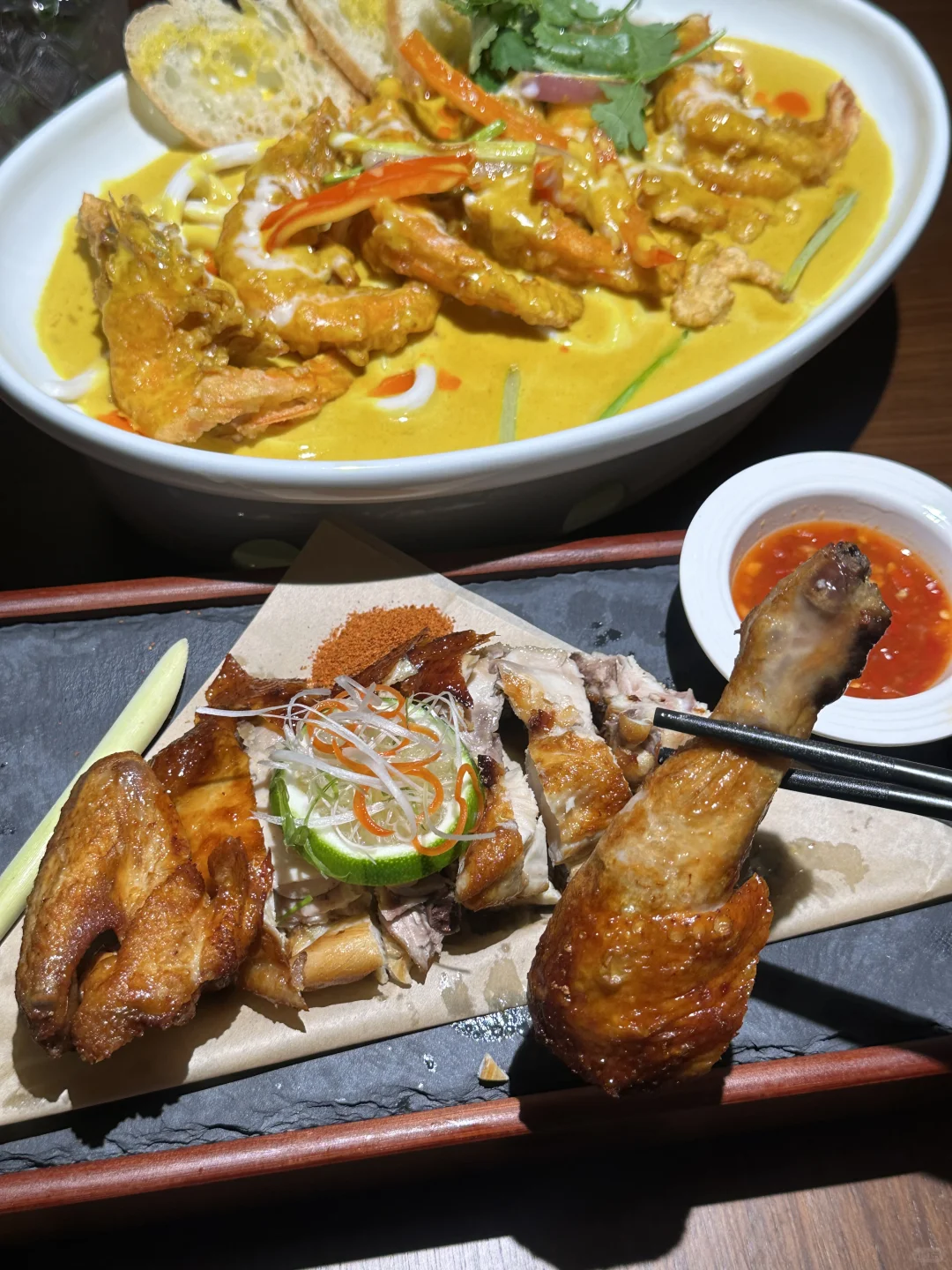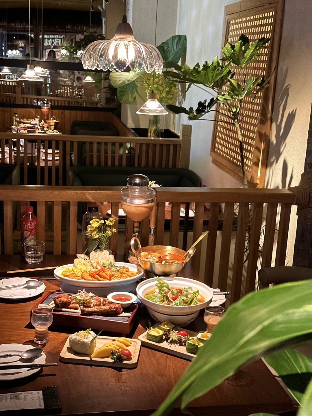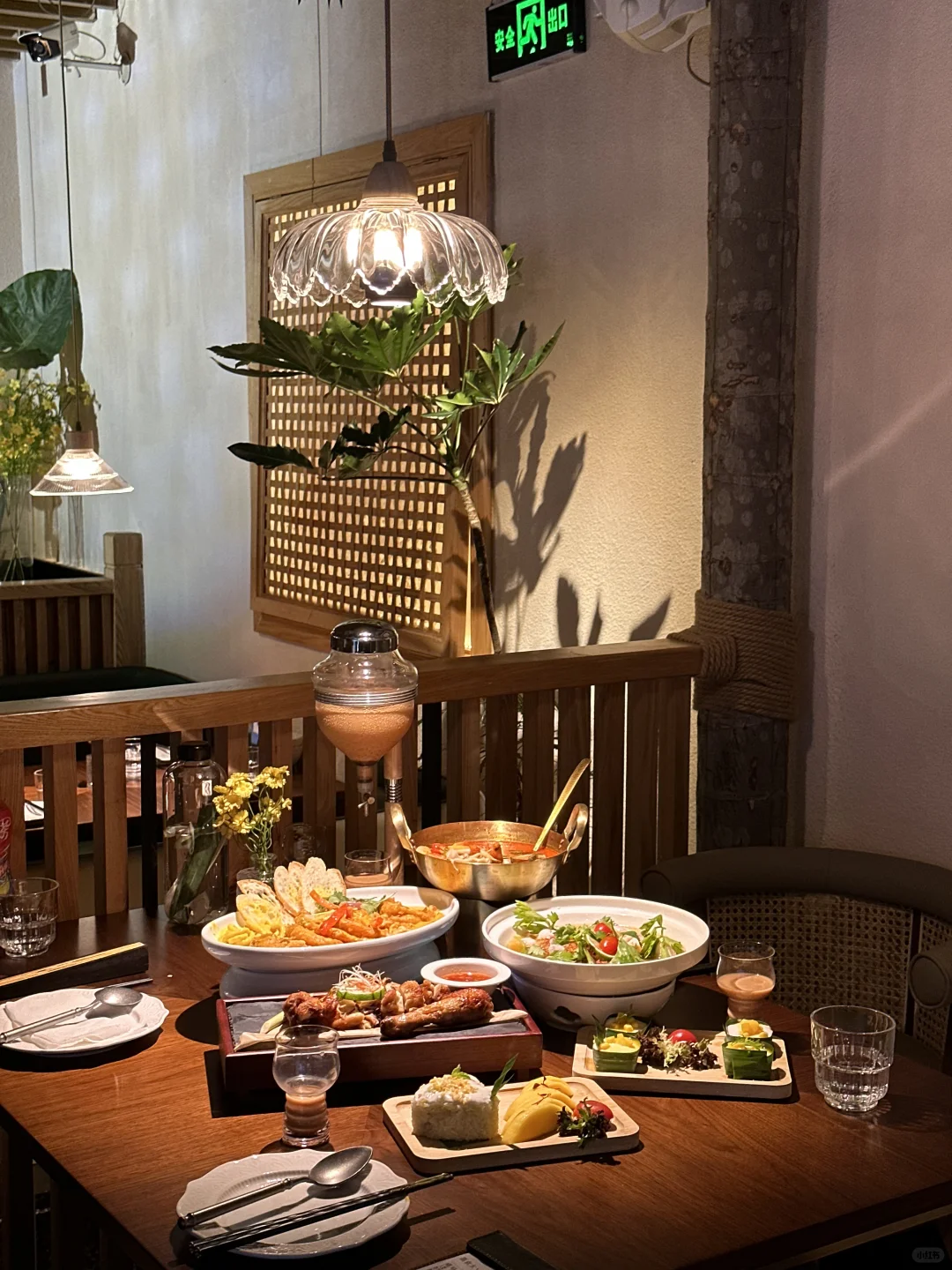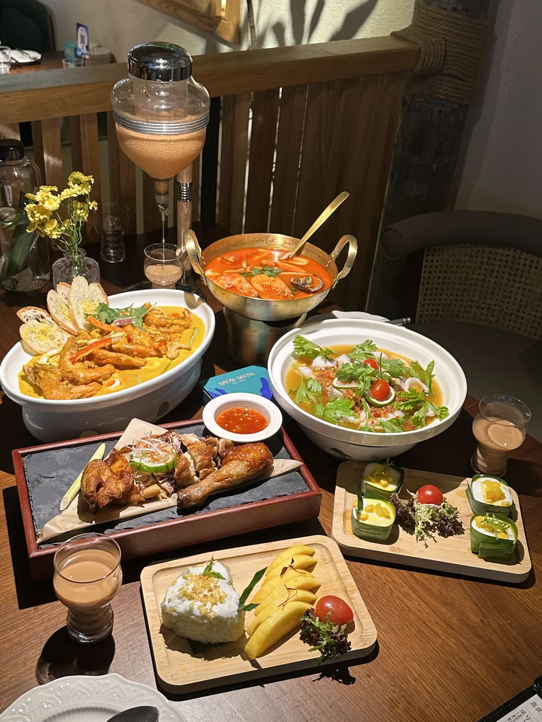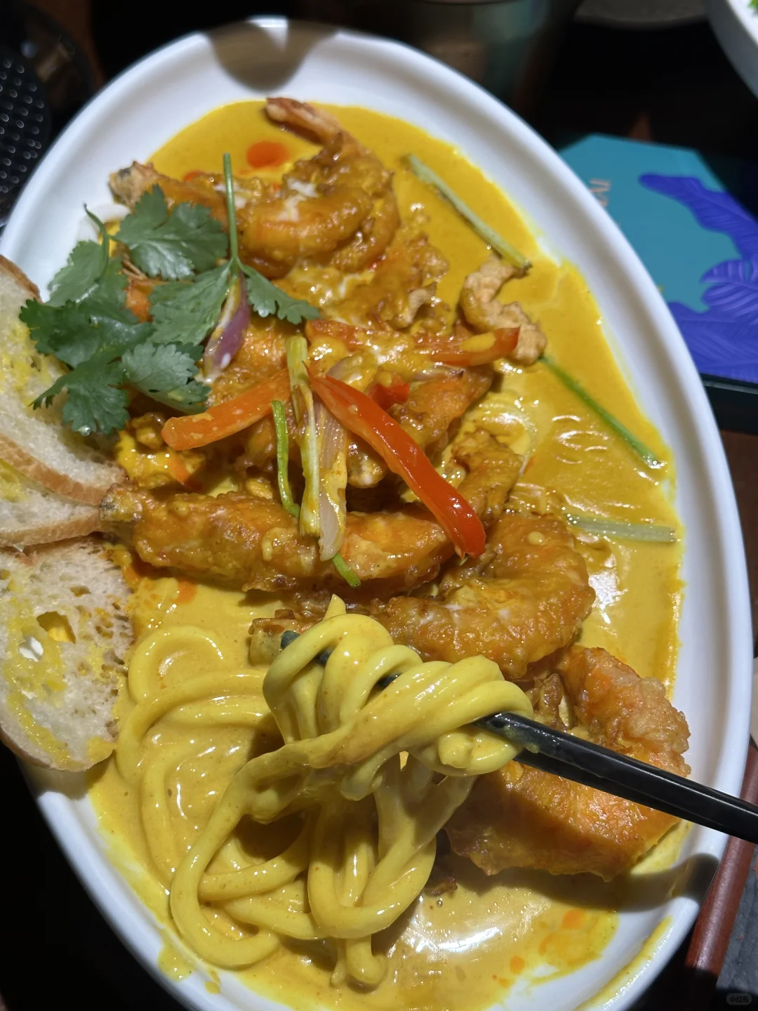 近期桂林好火的一家泰餐新店 刷到好多宝子的贴,跟风去了一波✔️ 店里环境很好,很有异域风情 灯箱的画报好有国外度假的感觉 人不算很多点套餐非常划算 大虾海鲜冬阴功 酸酸辣辣夏天喝真的很开胃! 虾和贝都很大只诶,而且非常新鲜 焖咖喱大虾 咖喱风味很浓郁,虾炸过再焖已经非常入味了 里面居然还有乌冬面裹上酱汁好爽滑 青柠碎辣椒鱼片 这道菜闭眼给我点!!鱼片Q弹爽滑 酸辣酸辣的太适合夏天了 照着点绝对不踩雷!!每样单品都好吃 姐妹聚会情侣约会的家庭出行的都可以考虑这里