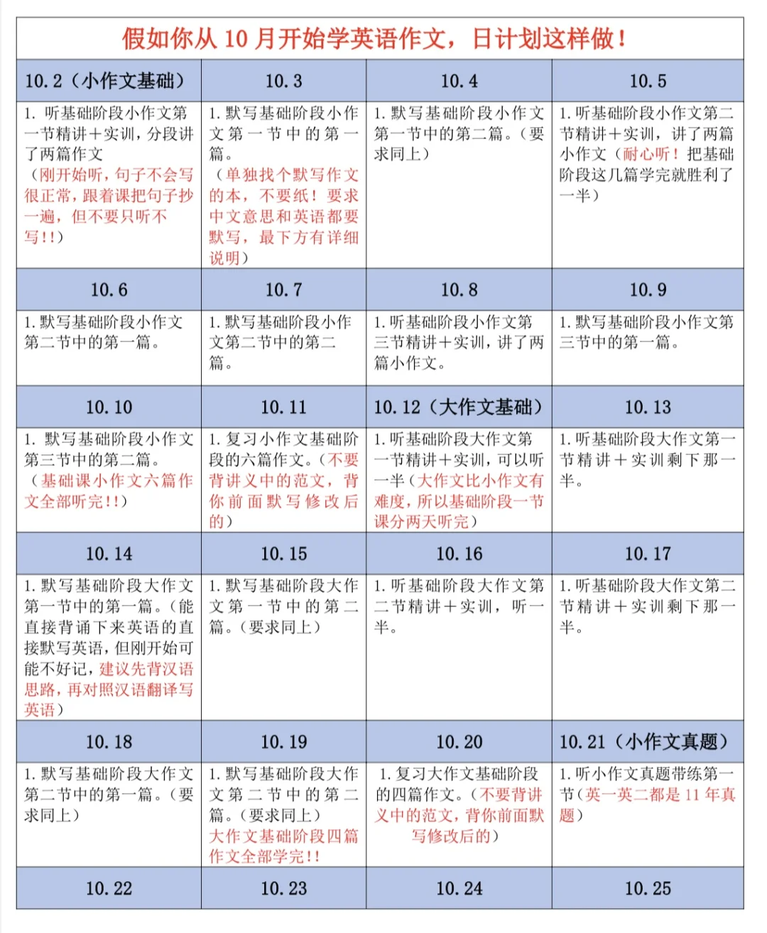 今天如期给大家分享十月份开始考研英语作文,详细的日计划表!如果你现在还没有开始学作文,就可以完全按照这张表来走。考研倒计时仅剩70多天,知道大家时间紧任务中,所以基础阶段的课正常听课默写,慢慢来~到了后面真题带练的时候就可以听一部分,剩下的自己写一写背背参kao答案就可以了。