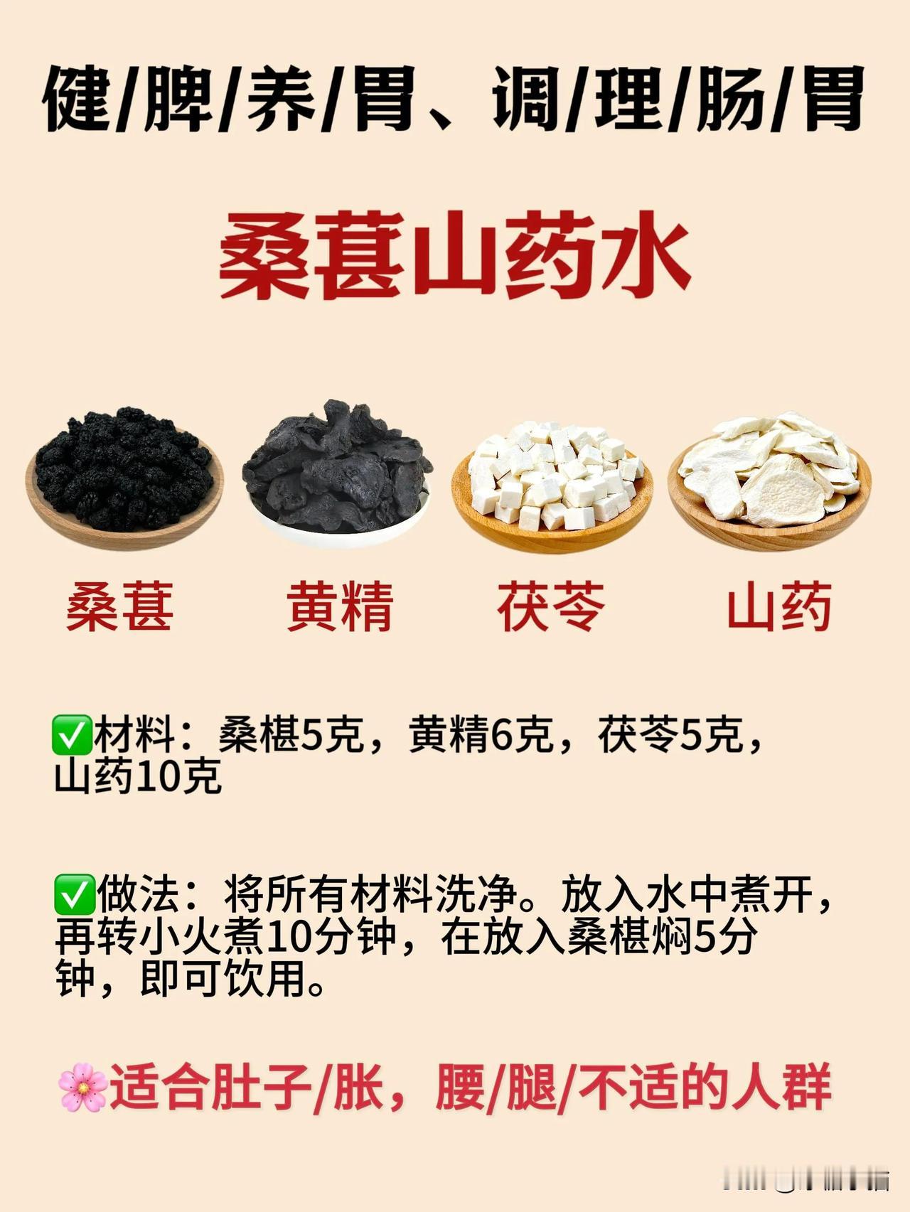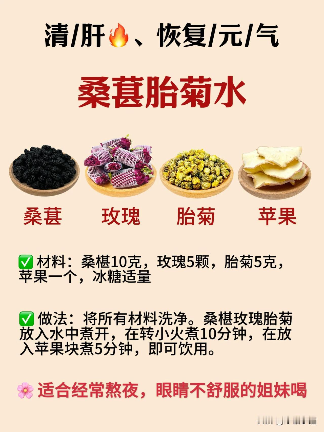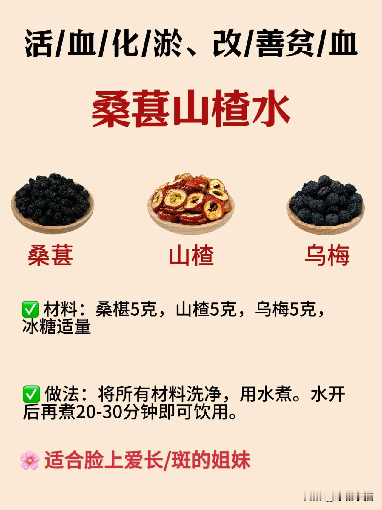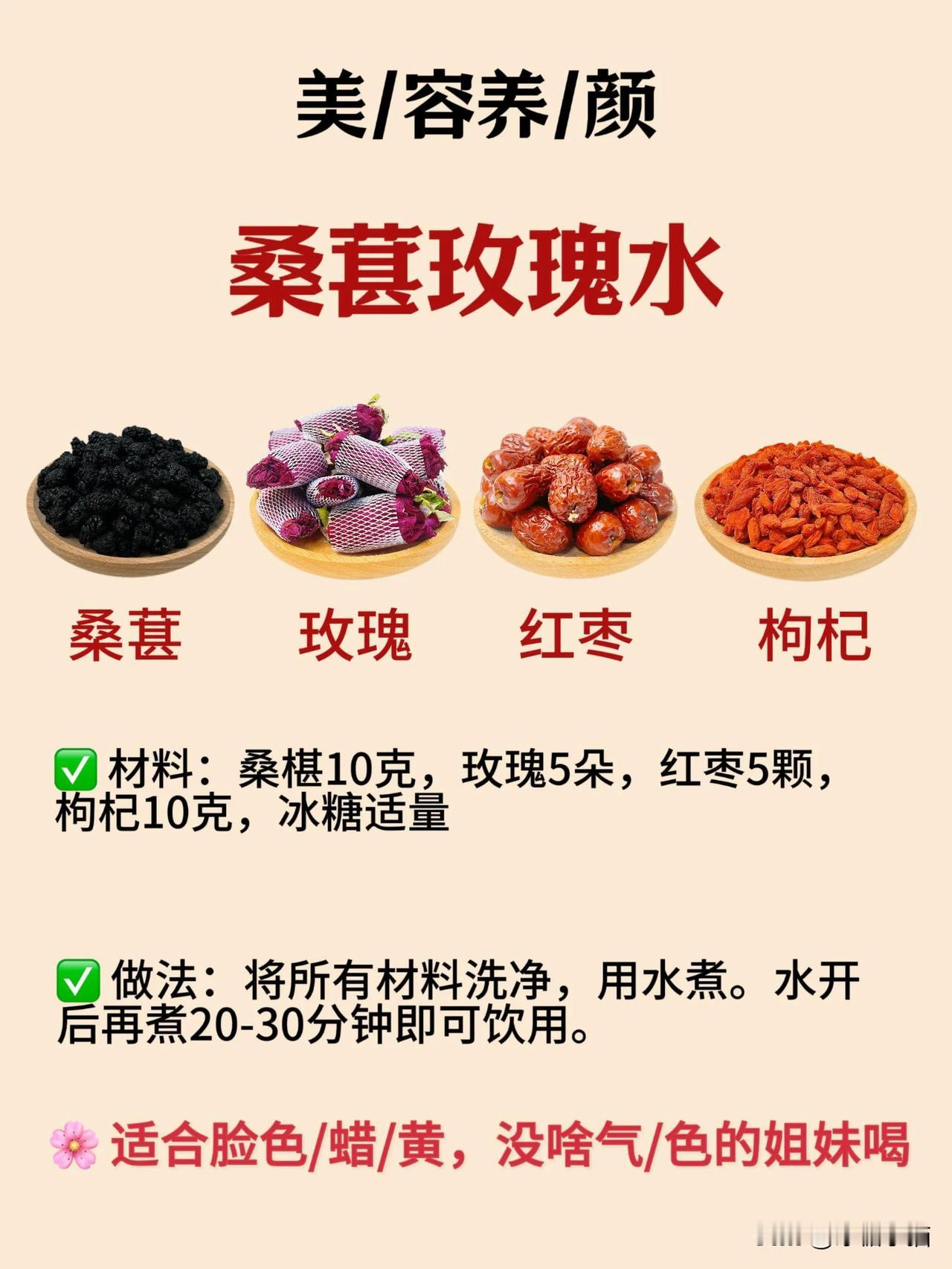 桑葚富含丰富的花青素、氨基酸、维生素和矿物质等营养成分。中🧑⚕️认为:桑葚具有生/津润/燥、补/🩸滋/阴、明/目乌/发等功/效,特别适合秋天食用🍂 给姐妹们分享4种桑葚的实用搭配,总有一款适合你! 1️⃣桑葚山楂水➡️爱长斑斑点点喝 🌸桑葚5克➕乌梅5克➕山楂5克 2️⃣桑葚玫瑰水➡️脸色黄黄的没有汽色喝 🌸桑葚10克➕枸杞10克➕红枣5颗➕玫瑰5朵 3️⃣桑葚胎菊水➡️经常熬夜🌛喝 🌸桑葚10克➕胎菊5克➕玫瑰5朵➕苹果1个 4️⃣桑葚山药水➡️肚肚鼓鼓涨涨的喝 🌸桑葚5克➕山药10克➕茯苓5克➕黄精6克 ❌食用禁/忌:啤胃/虚/寒者不宜多食。 #分享养生好物# #黑枸杞黄芪茶# #百合桑葚茶# #黄芪丹参山楂茶# #每天一杯养生汤# #抗炎疗愈饮# #三参枸杞水飞蓟# #别样的养生推荐# #想喝果计就用它# #我的养生搭子#