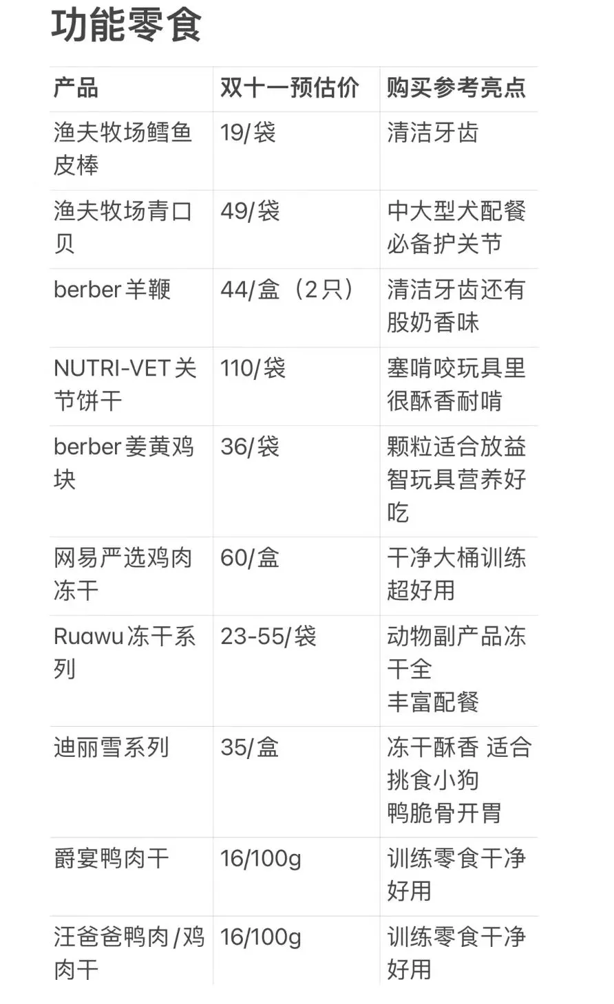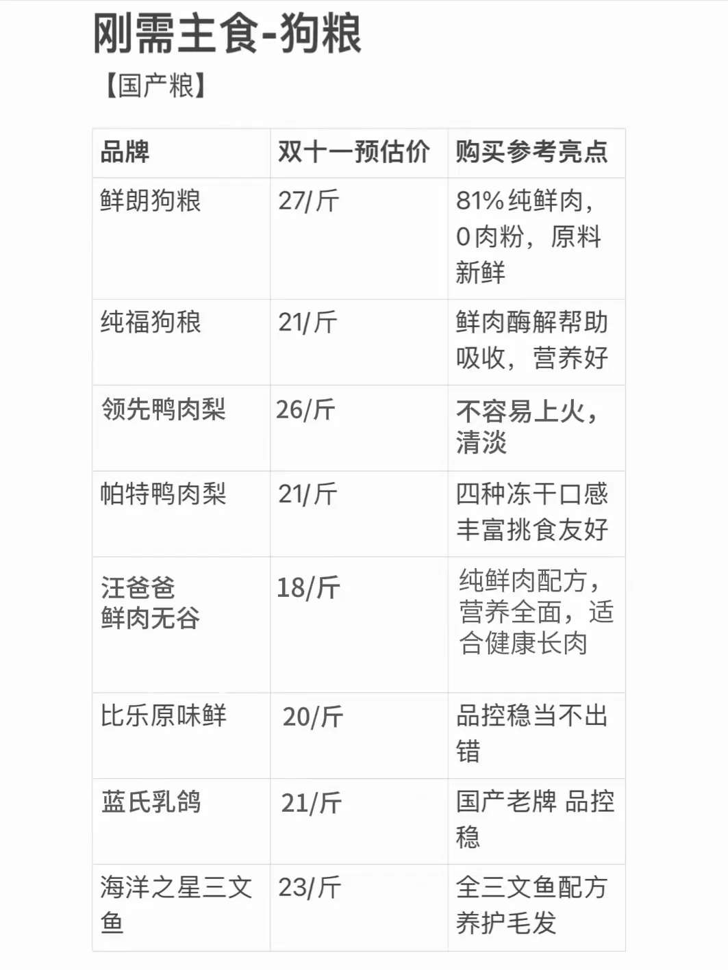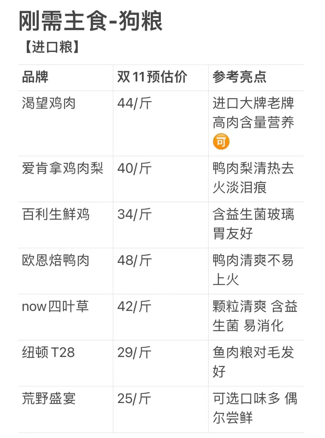 又到了一年一度的养狗人购物囤货的日子,打工人真的伤不起,为了守护住小荷包,我整理了一些自己和身边朋友用过的、不踩雷的一些养狗好物!附上了大促预估价格和每个品的特点和感受,大家可以参考借鉴! 主要就是进口粮、国产粮、主食罐头、主食冻干、内外驱、保健、零食这些