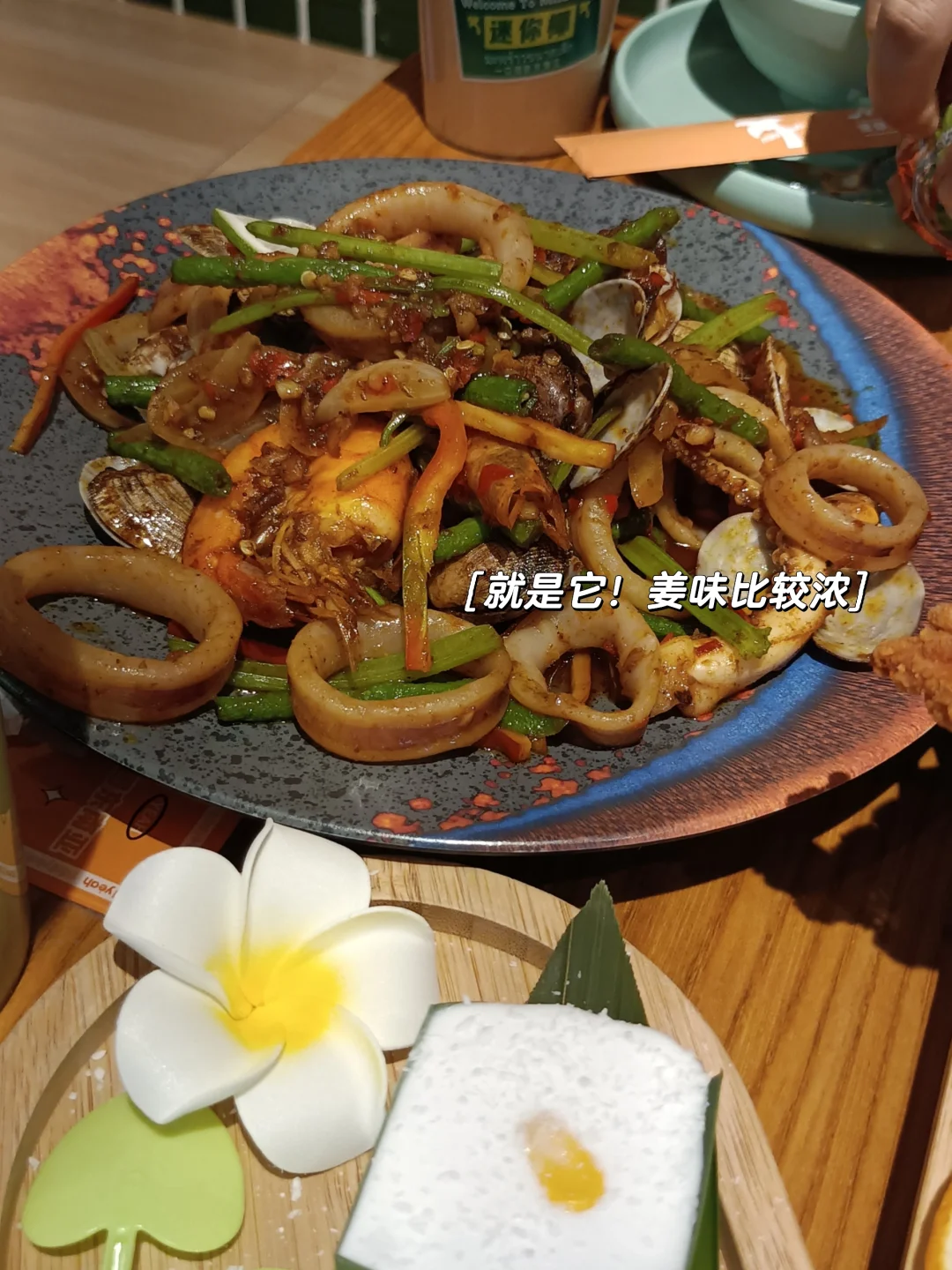 🍤泰式金不换辣炒海鲜:我口味可能比较重,这道菜香是香,不过姜味比较突出,包括还有很多小姜渣,厌姜的友友记得避雷。不过带的虾都很大只分量也很OK的。
