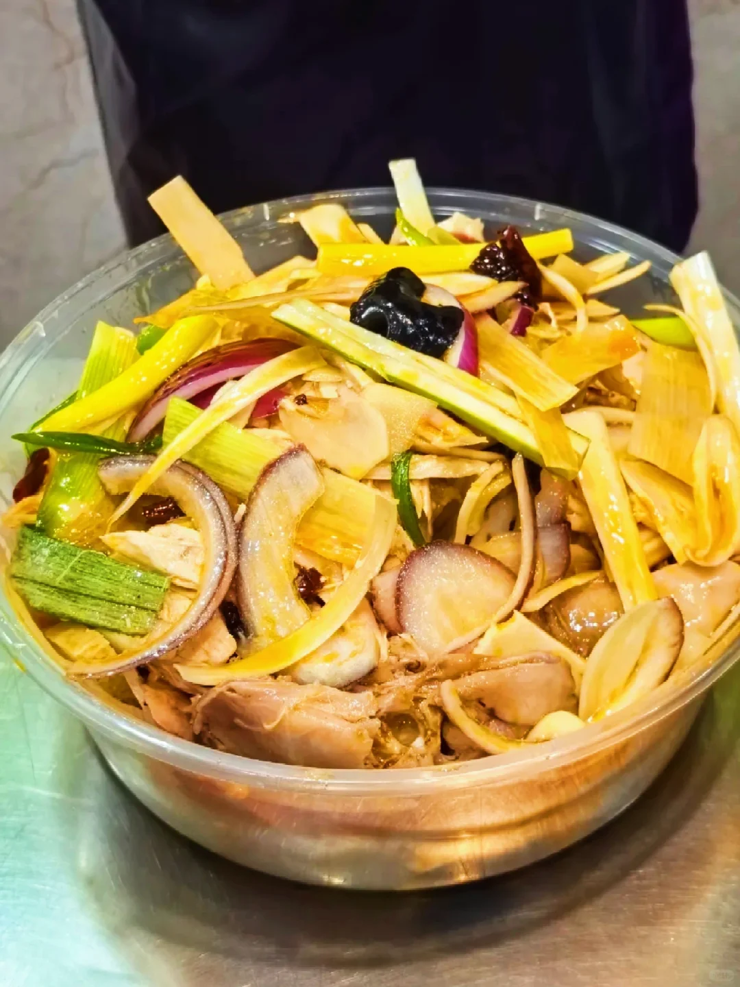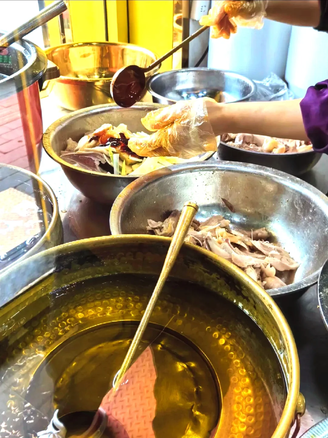 实不相瞒,我是第一次吃这个,也属实惊艳到我了,老板会当着你的面操作,十几种中药秘制熬制城的土鸡,当着你的面撕开,一点一点,非常认真,非常细致,撕完以后配上煮熟的配菜、新疆特色皮牙子,然后鸡汤、辣椒直接拌哦!