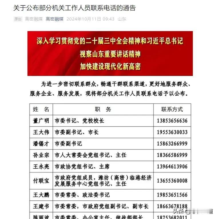山东高密公布所有单位一把手电话,方便群众办事,到底有没有必要?不是要你打入办事的,而且在你办事时遇到困难可以拨打,如果办事都靠一把手他就是三头六臂也办不过来几件事?现在有专门的办事大厅,各个部门几乎集中到一起,能办的肯定就给你办了,谁也不会想拖你,因为没有必要,不符合规定的肯定办不了,找谁也不好使,但是一样米养百样人,谁也不知道会不会碰到拖,疲,懒的办事人员或者说遇到意外情况,这个号码就是为此准备的,总之公布电话号码这事,还是利大,起码姿态是对的,拉近了群众和官员之间的关系。换做以前恐怕你只能知道你们那里的市委书记是谁,现在好多了,连电话都有了。