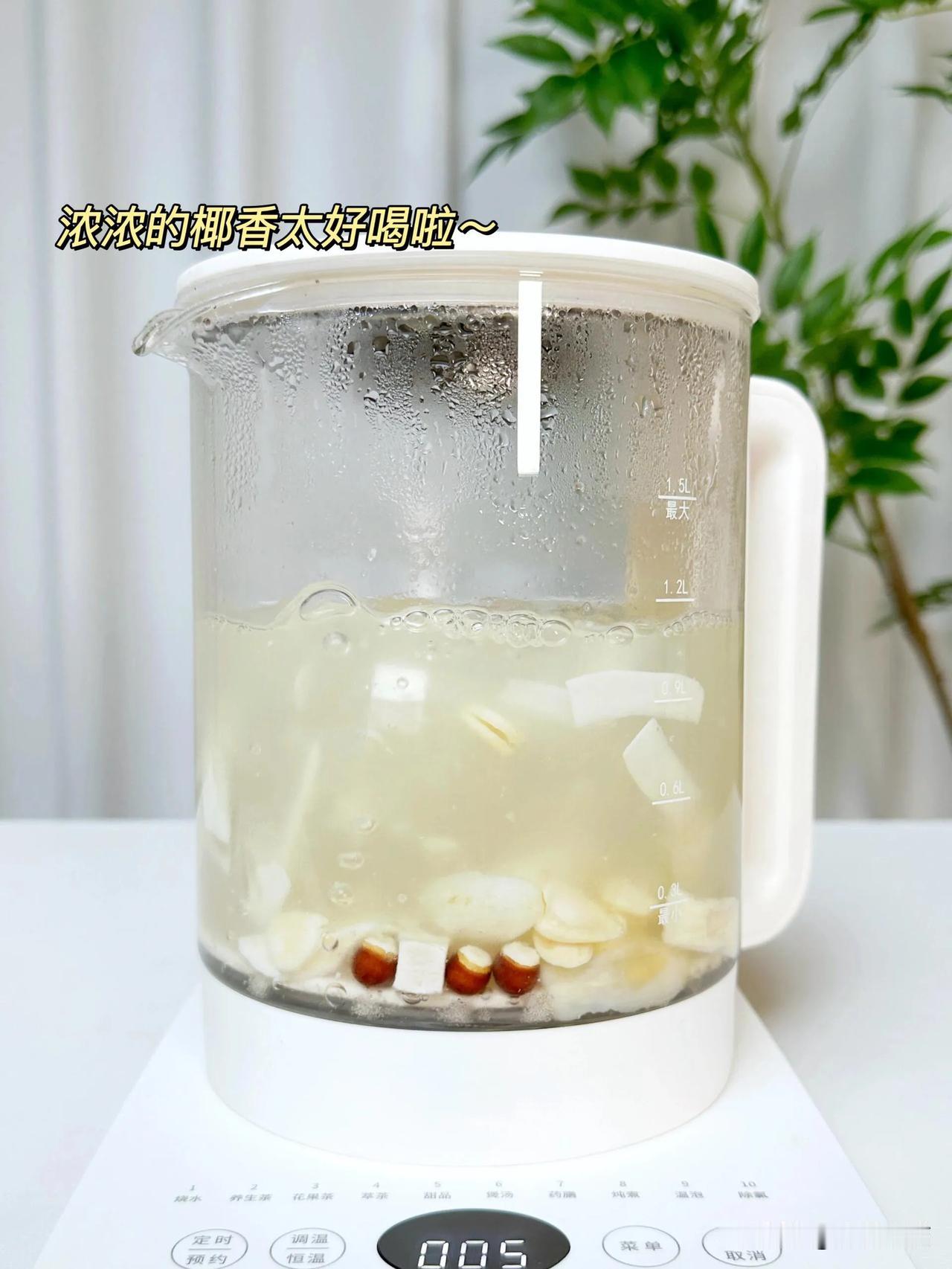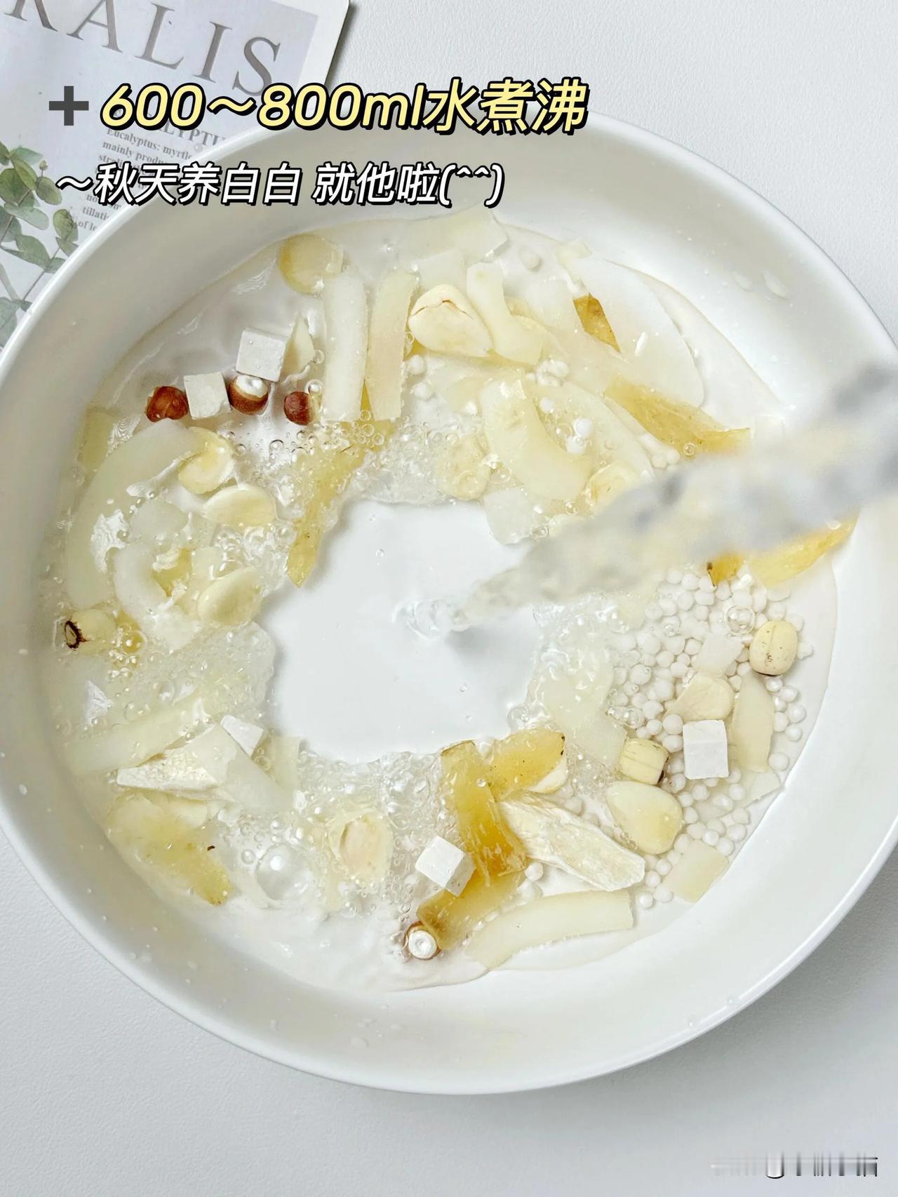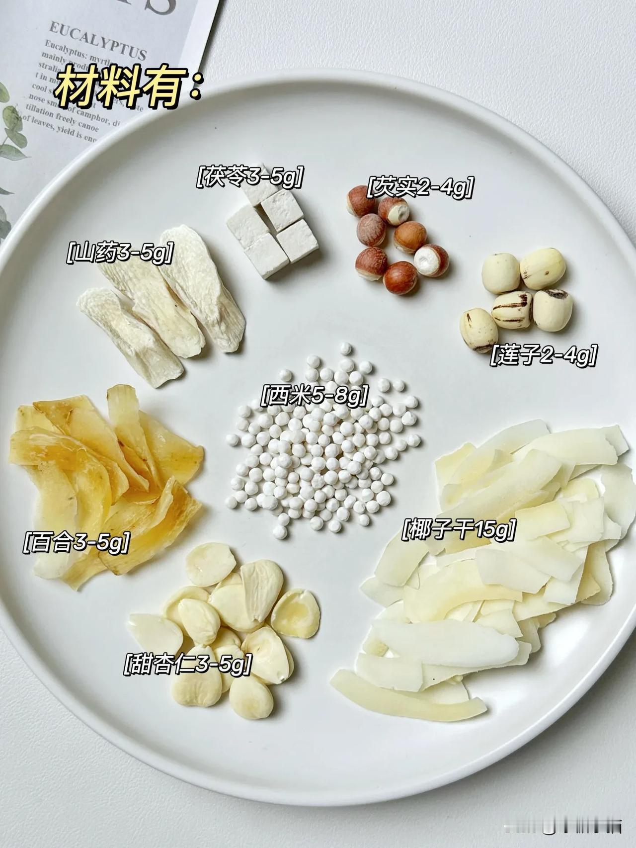 💯捡到了一个很好喝的方子 秋季天气干燥,想要皮肤更加⚪️⚪️, 做到以下几点很简单👇🏻 ✔️要为皮肤补充更多水, ✔️要调养我们的啤胃, ✔️更要多吃白色的食物, 这个搭配全部满足💯 ✊姐妹们作业抄起来 ✅材料: 椰子干15g➕甜杏仁3-5g➕百合3-5g➕山药3-5g➕茯苓3-5g➕芡实2-4g➕莲子2-4g➕西米5-8g ✅做法: ➕600-800ml水煮开即可 秋天来一杯,暖暖的,关键浓浓的椰香… 也太好喝了~ #馨妈养生甜汤# #红豆雪梨饮# #雪梨山楂百合饮# #木瓜葛根饮怎喝# #抗老美颜饮# #每天一杯养生汤# #牛蒡柠檬# #花生红枣枸杞露# #金桔雪梨枸杞水# #黄芪麦冬养生粥#