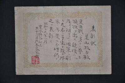 图7:侵华战争时期北海道札幌市对有 9 个孩子的家庭的奖状。