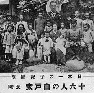 图9:长崎县的一名叫白戸半次郎的经理20年间和妻子生育16个孩子,在接受《画報躍進之日本》杂志采访时他说:“10个男孩都想当兵。”日本政府当时用“子宝部队”来称呼这些在一个家庭里被大量生育出的孩子。