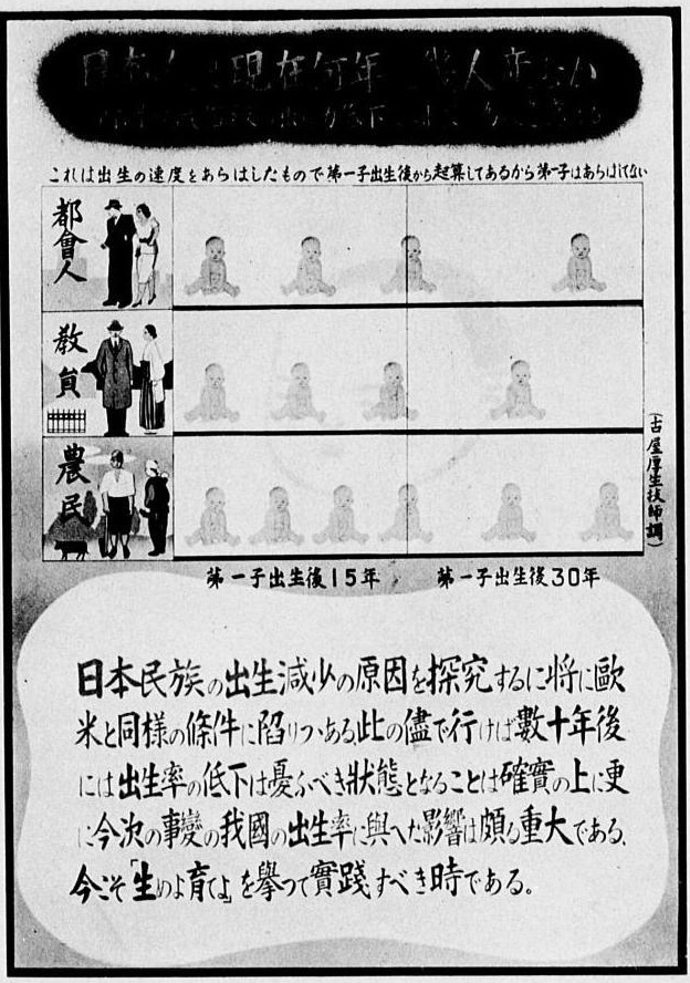 在当时,日本的报刊杂志也充斥着为国生育士兵的军国主义口号,大肆鼓吹生育好几个甚至十几个孩子的家庭。这些孩子都被视为未来的士兵,而不是独立的人,在日本战后,这些成为战争孤儿的孩子成为了严重的社会问题。