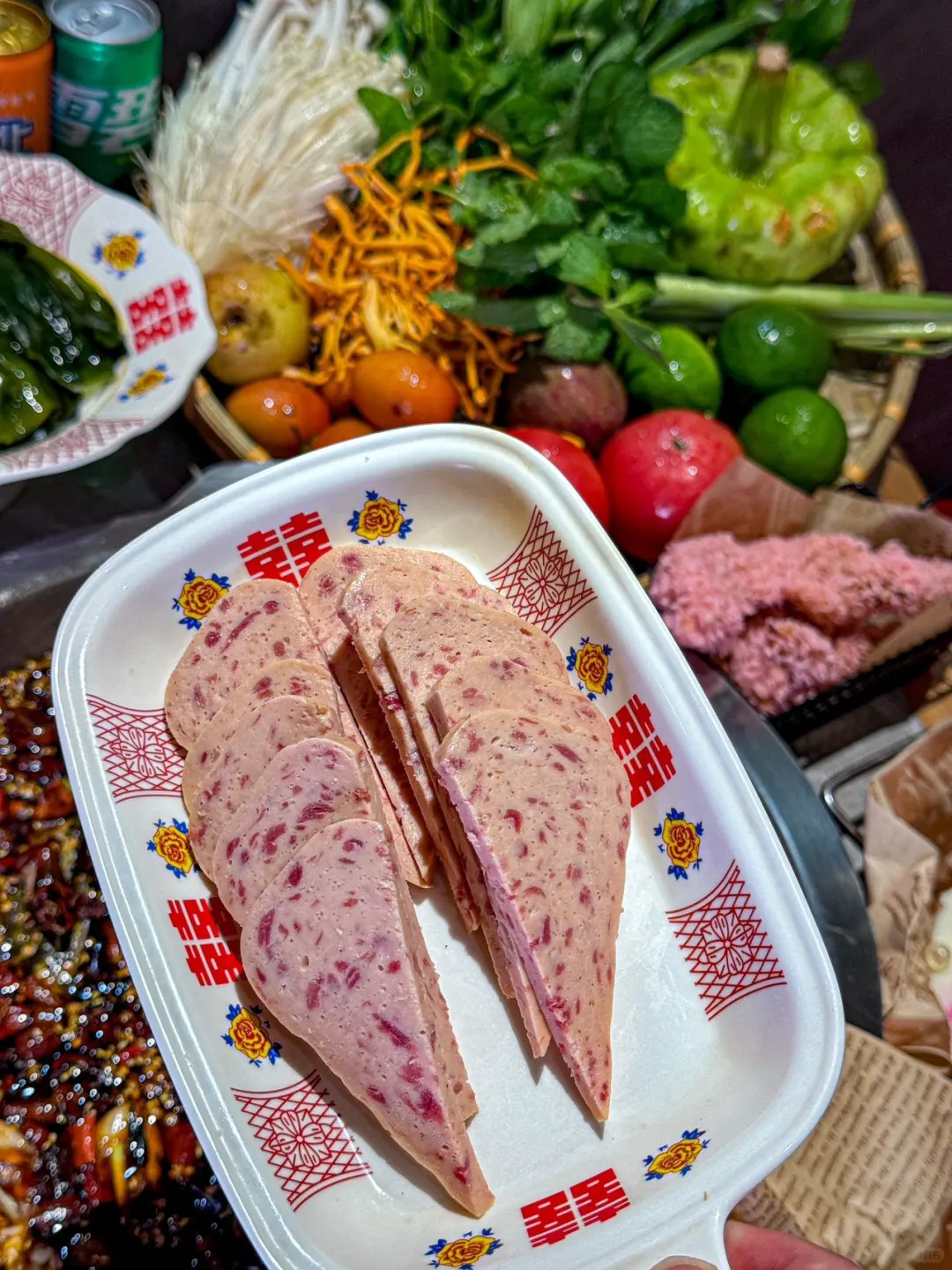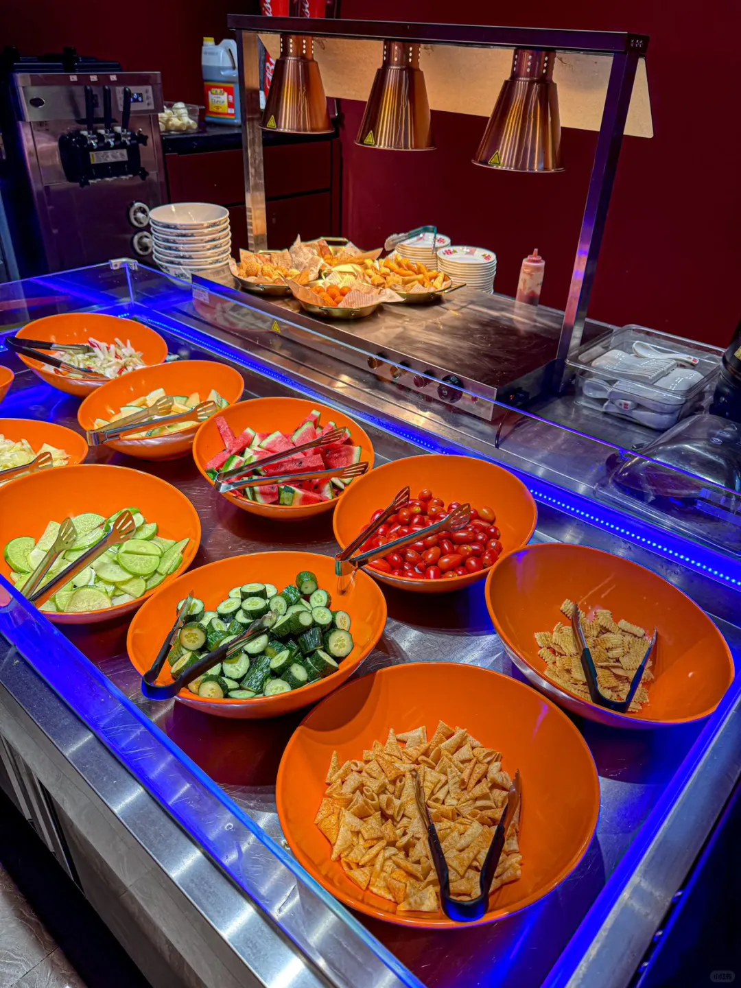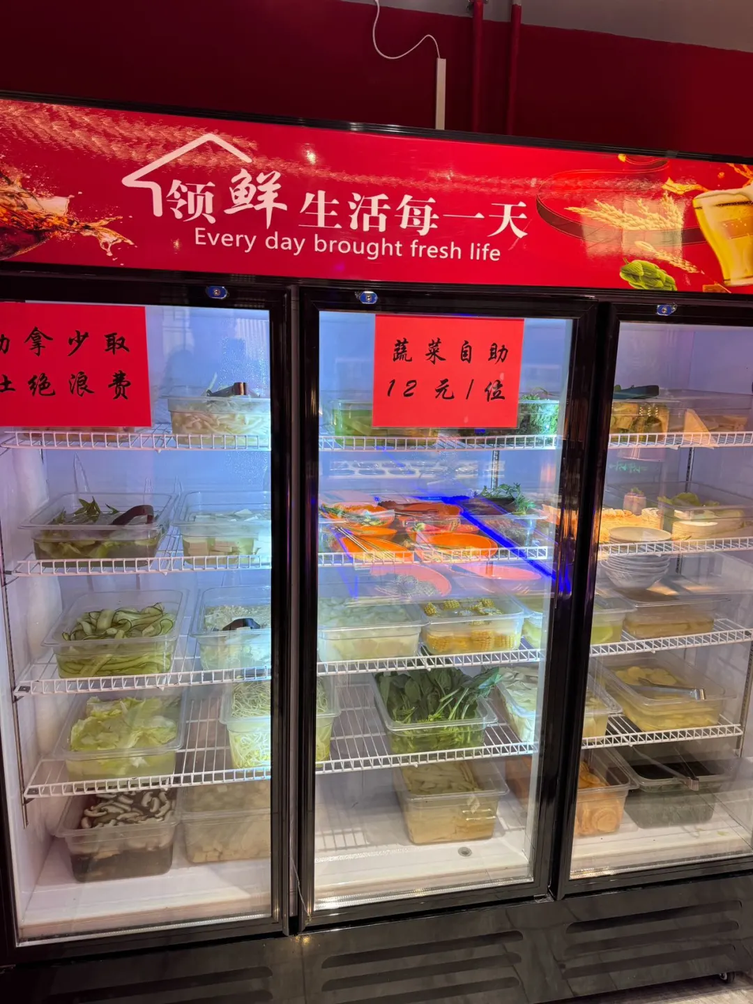 在涮菜方面,店内有着自助的菜品冰柜,只需要12元一位,蔬菜🥬,豆制品等都可以无限畅吃喔,还🈶水果,凉菜也全部都是自取的!