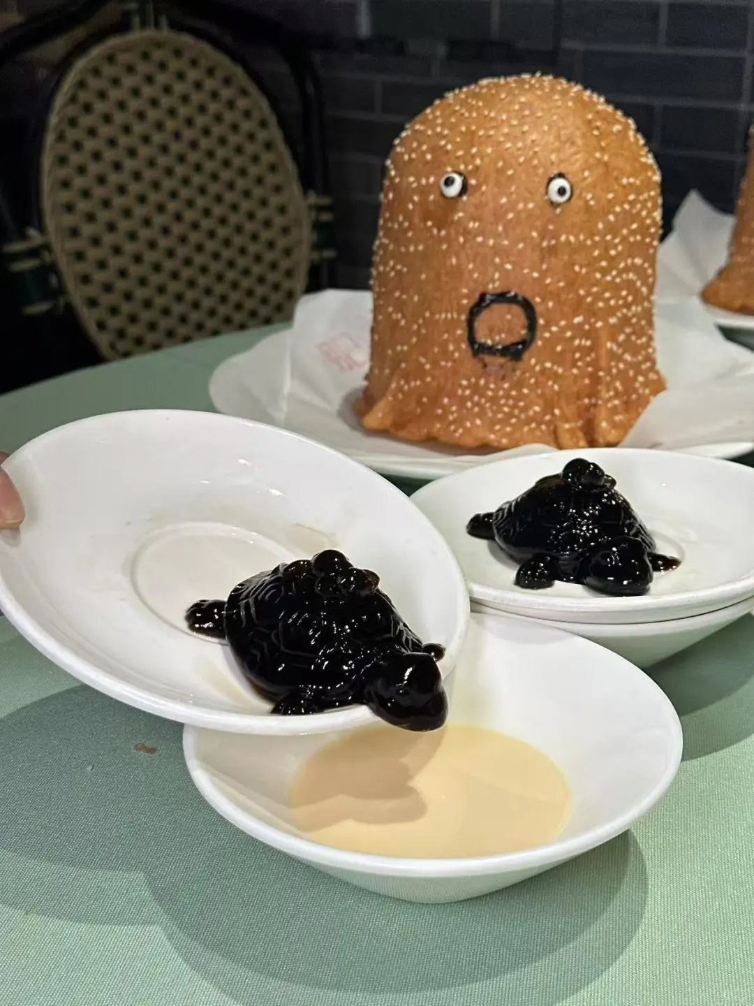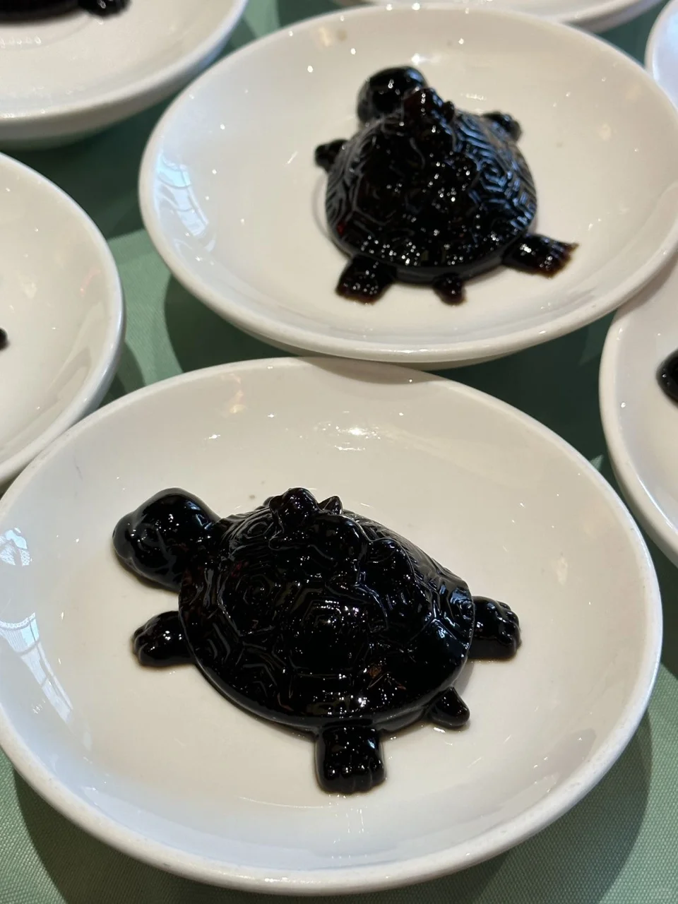 不用去广东一样沉浸式体验广东岭南风,茶餐厅用餐区,大锦鲤🐟灯笼🏮,大寿桃🍑灯笼🏮,福禄寿送祝福,还有活灵活现的舞狮🦁表演。 🐢🐢🐢:duangduang逼真的小乌龟🐢形状的龟苓膏,可爱到不忍心吃。 🍽️酸辣鱼翅:海南黄灯笼辣椒和野山椒小火🔥慢炖的鱼翅,大口吃鱼翅,犒劳一下辛苦的父母亲们。 肥福排档有一面墙的黑板上,贴满了来自全国各地的小票,肥福把全国最新鲜美味的食材空运到每一位宾客的碗🥣里面。