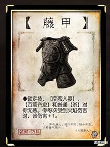 我们可以考虑削弱藤甲的被动效果。作为一件木质防具,按照“火克木”的属性相克原理,可以设计为在承受一次火伤后才会触发负面效果。这样的改动既符合历史背景,又平衡了装备的收益与风险,让玩家能够更安心地使用藤甲。众所周知,藤甲在游戏中创造了太多“冥场面”,常常与火杀、火攻等火伤效果紧密相连。