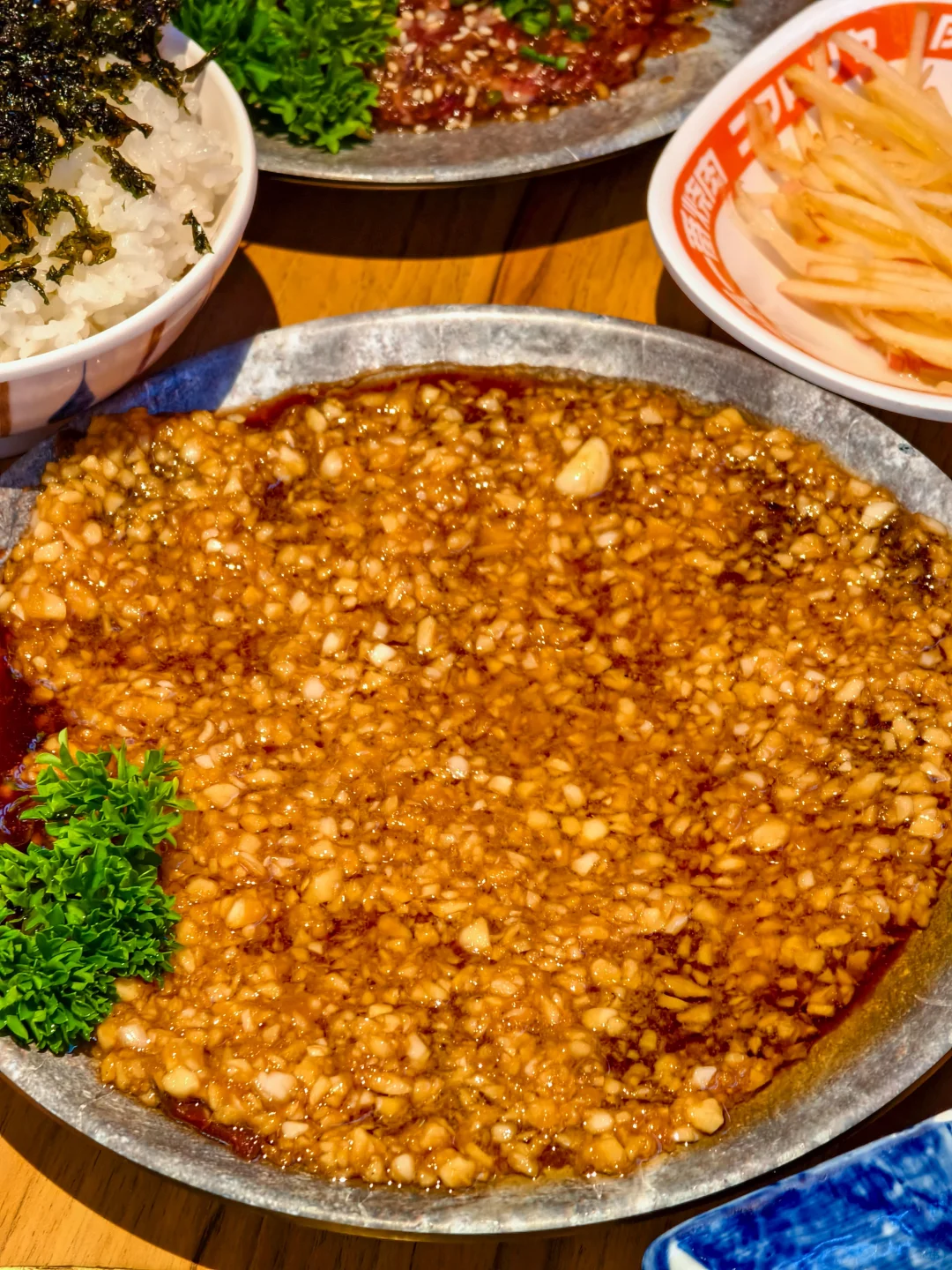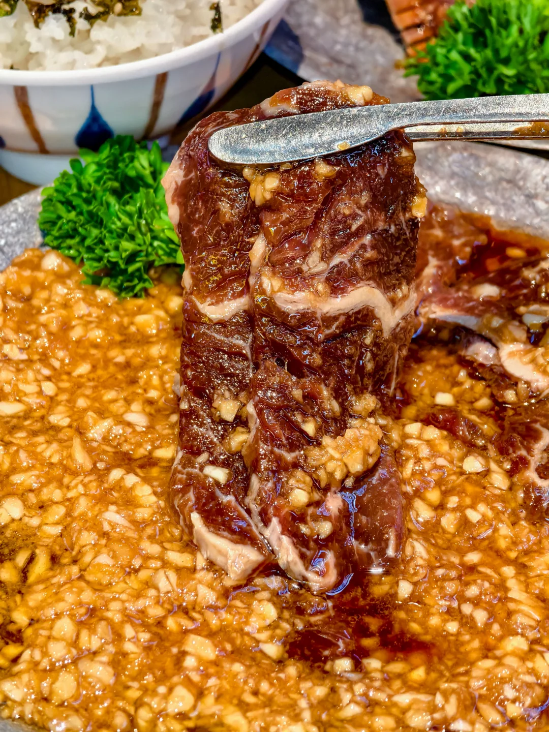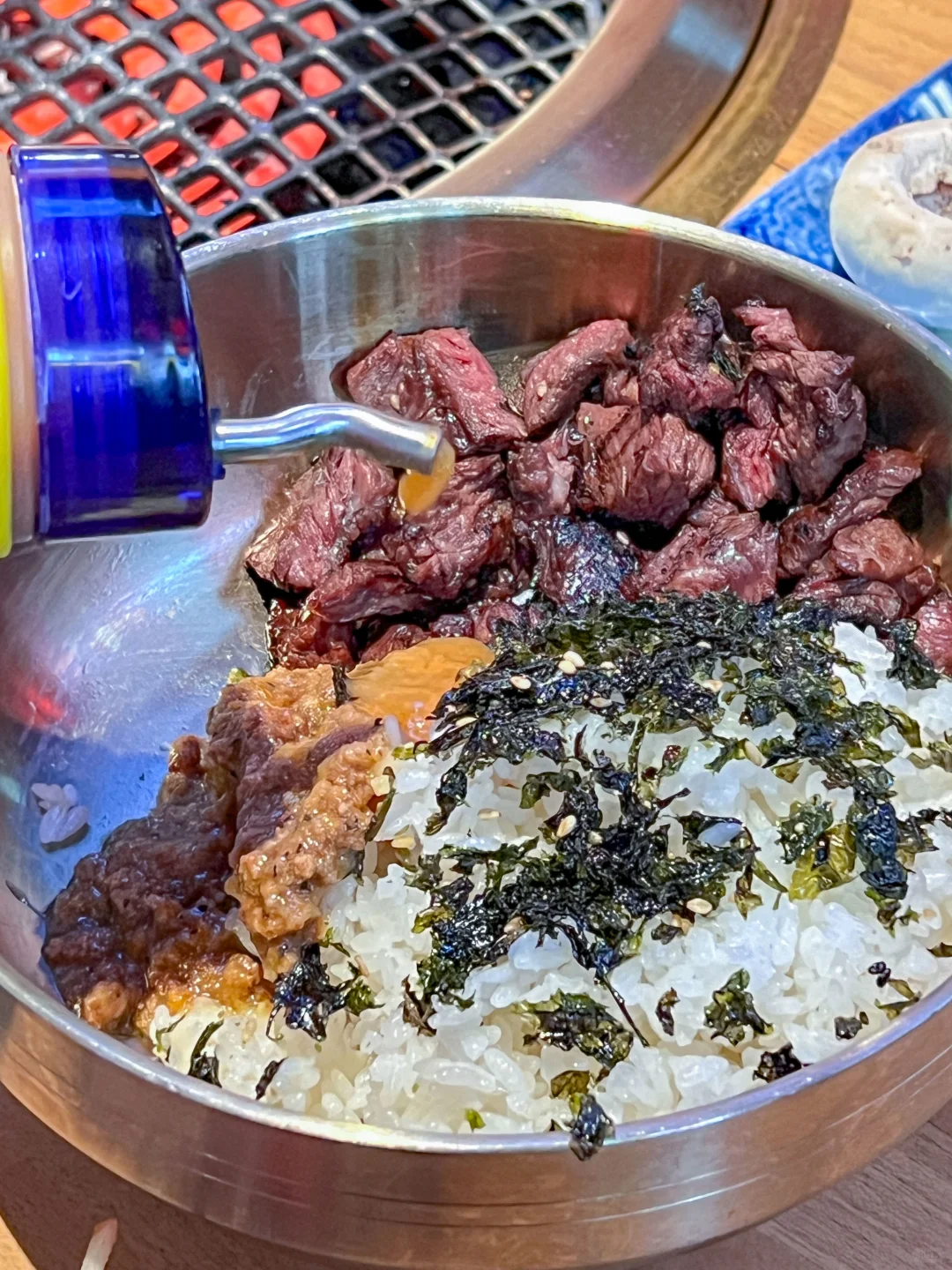 💥横膈膜超级大饭包:谁还没吃到这个超级大饭包,味道真的很绝!次世代横膈膜剪碎后加到带着海苔碎的米饭当中,再来点味增酱搅拌均匀,用牛米蔬菜拼盘里面的生菜包起来,口感超级丰富!